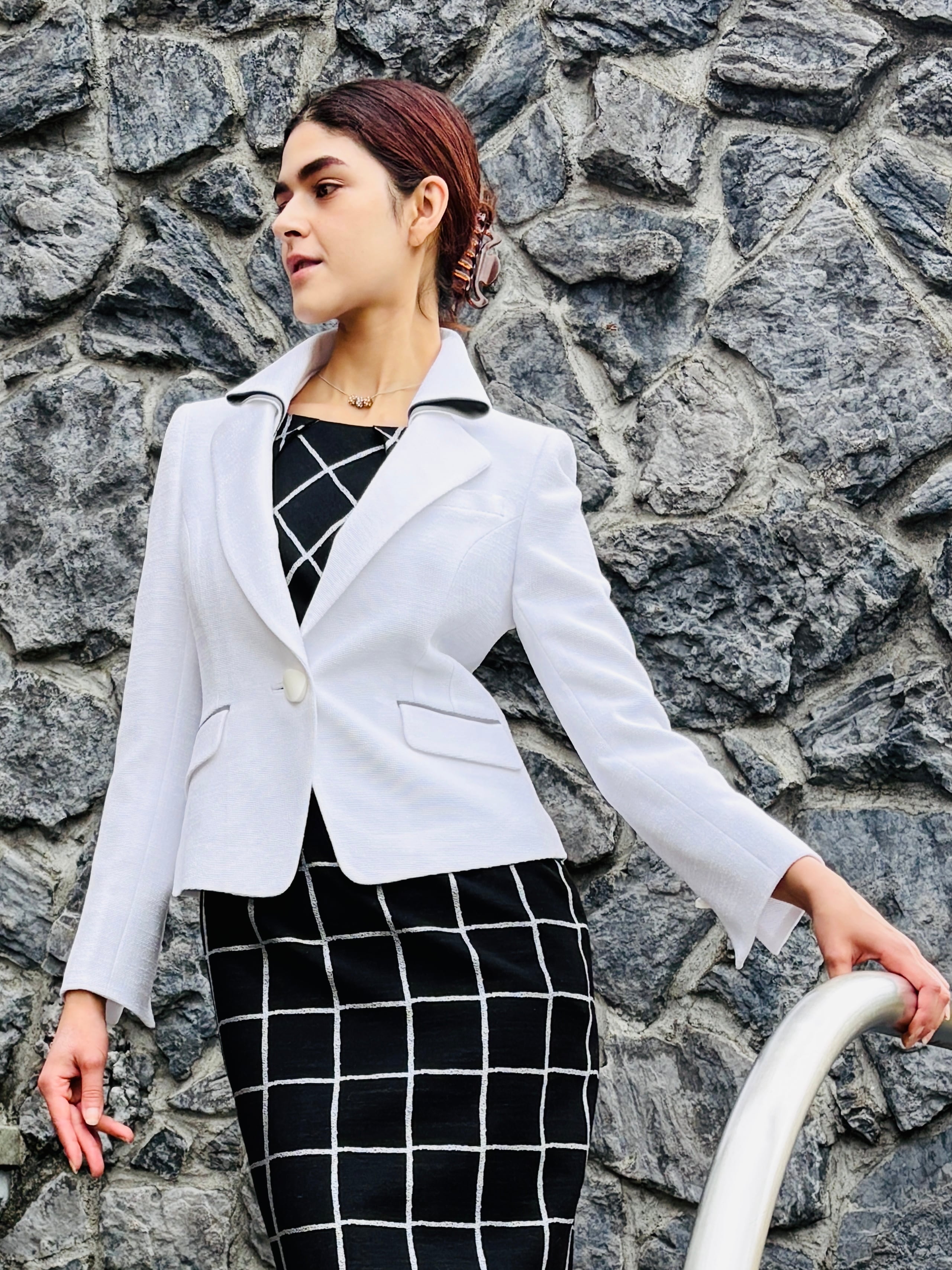 上品さとセンスを兼ね備えたホワイトジャケットです!マチに施されたグレーのアクセントが、全体のデザインに個性を与え、スタイリッシュな印象を醸し出します。特別なシーンからカジュアルな日常まで、幅広いシーンでコーディネートを楽しむことができる一品です。シンプルながらも洗練されたホワイトは、あなたのトータルコーディネートを引き立て、周囲の注目を集めるでしょう!