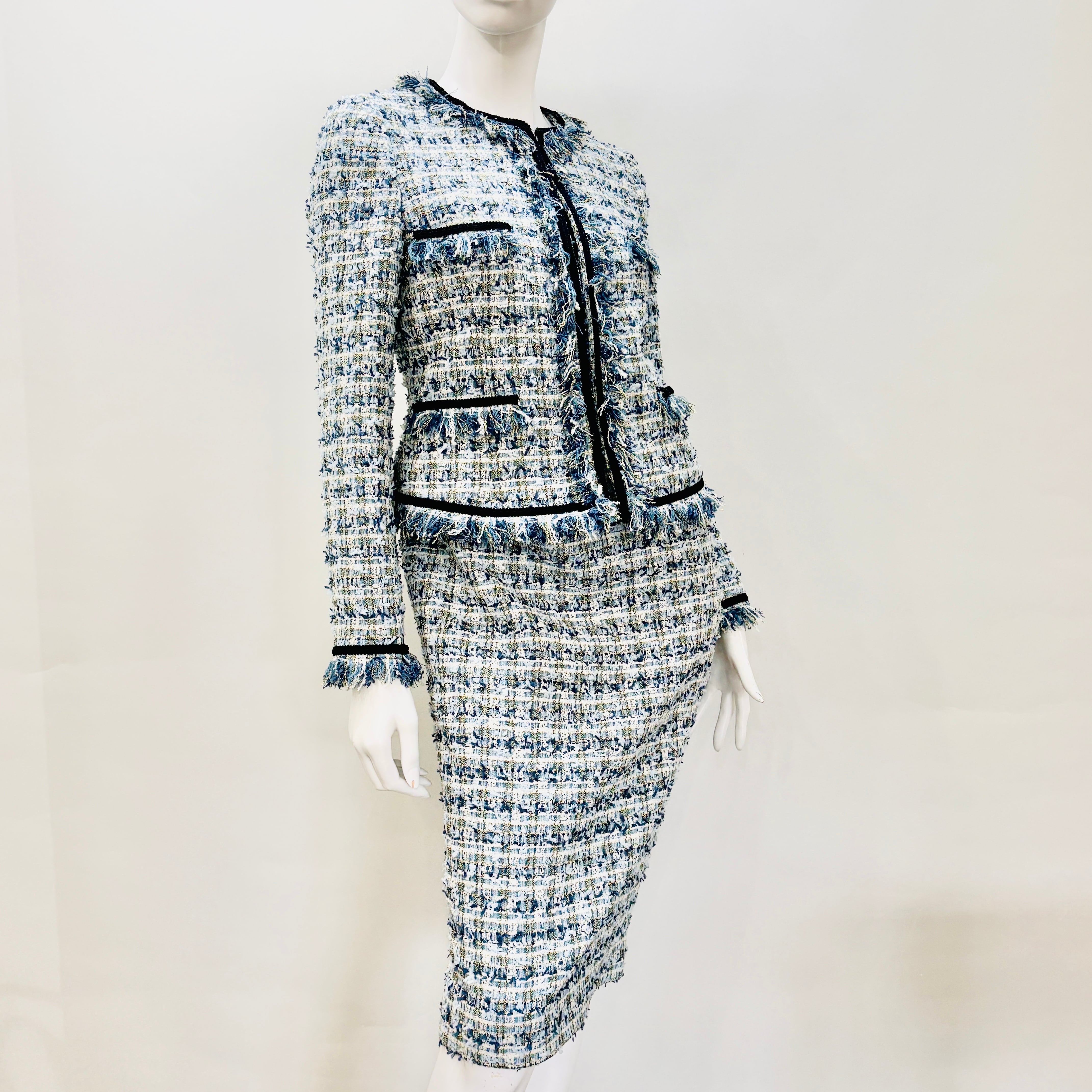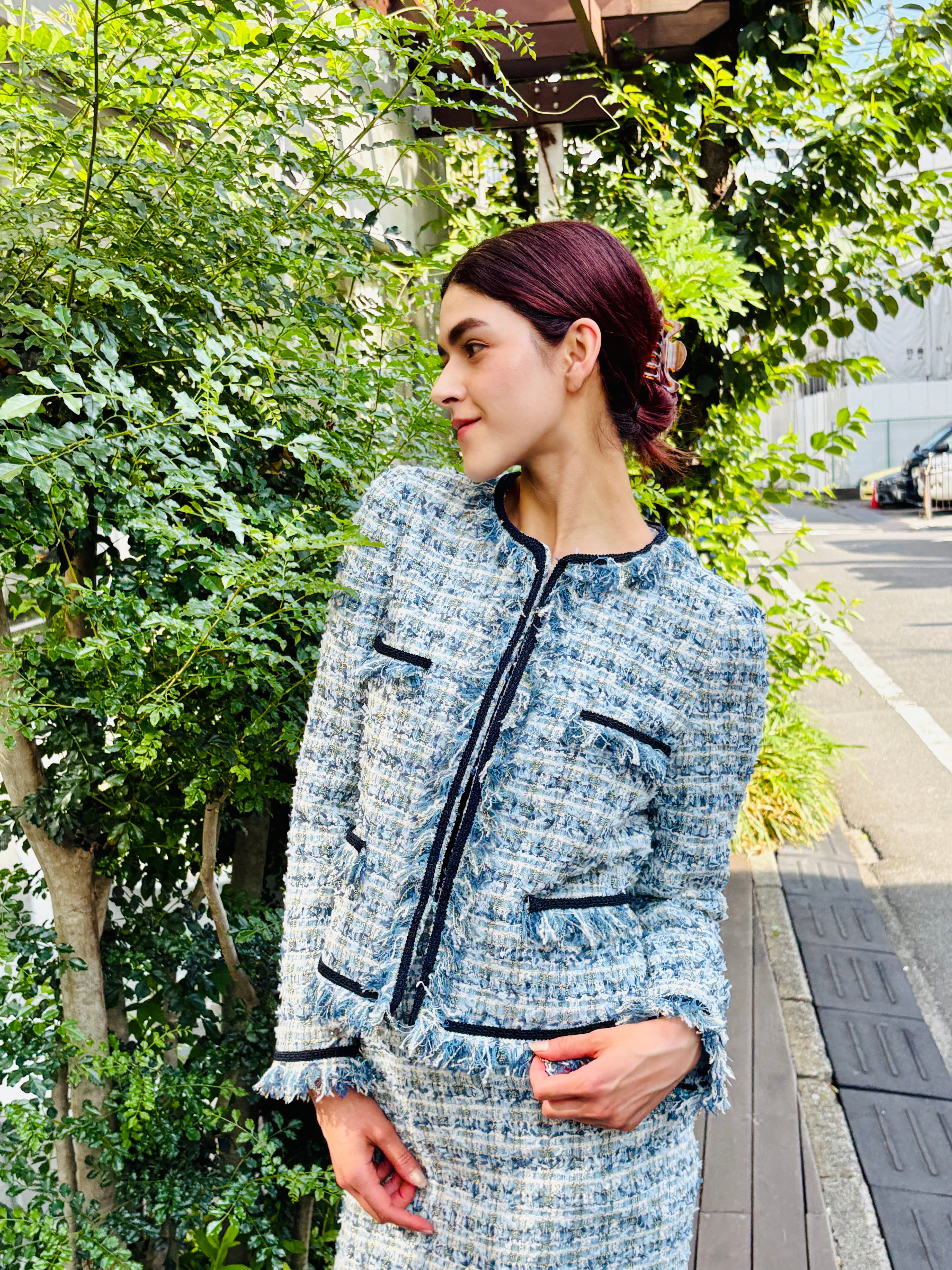 エレガントなツイードスーツが、共地フリンジのディテールで一層魅力的な一品に仕上がりました。スタイリッシュなブルーは、特別なシーンやフォーマルなお出かけにぴったりです。洗練されたデザインが、着用する方の上品さを引き立て、様々なコーディネートにマッチします!