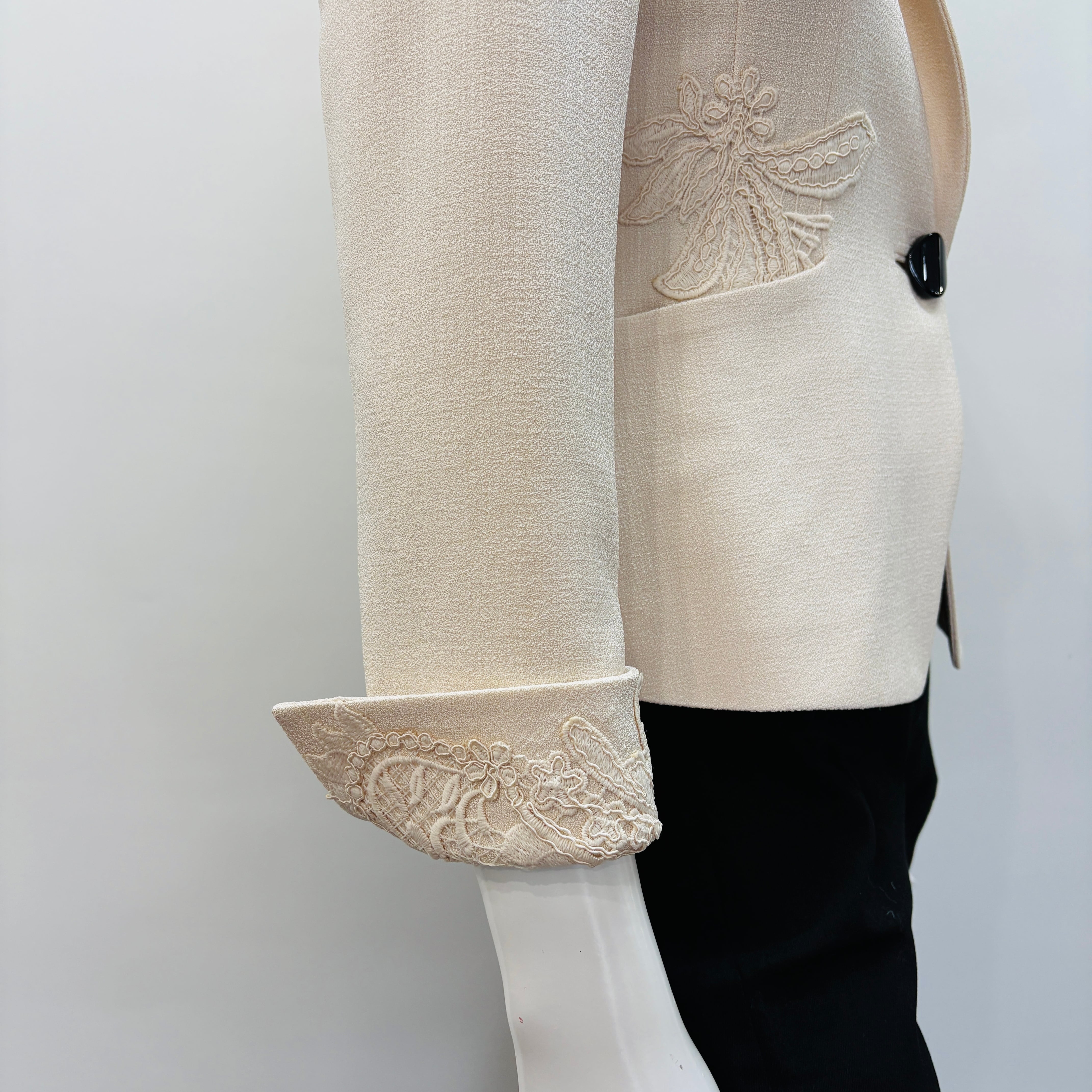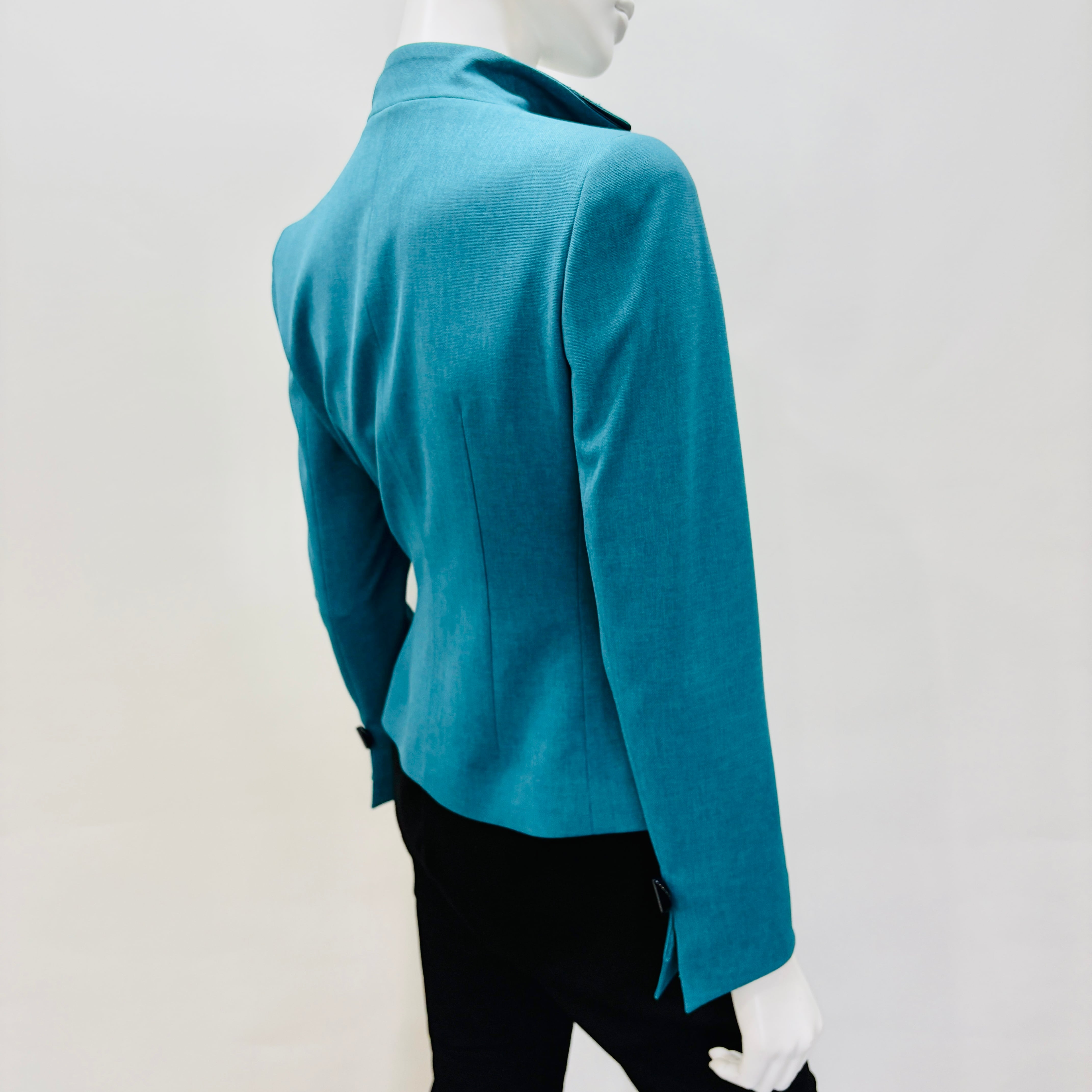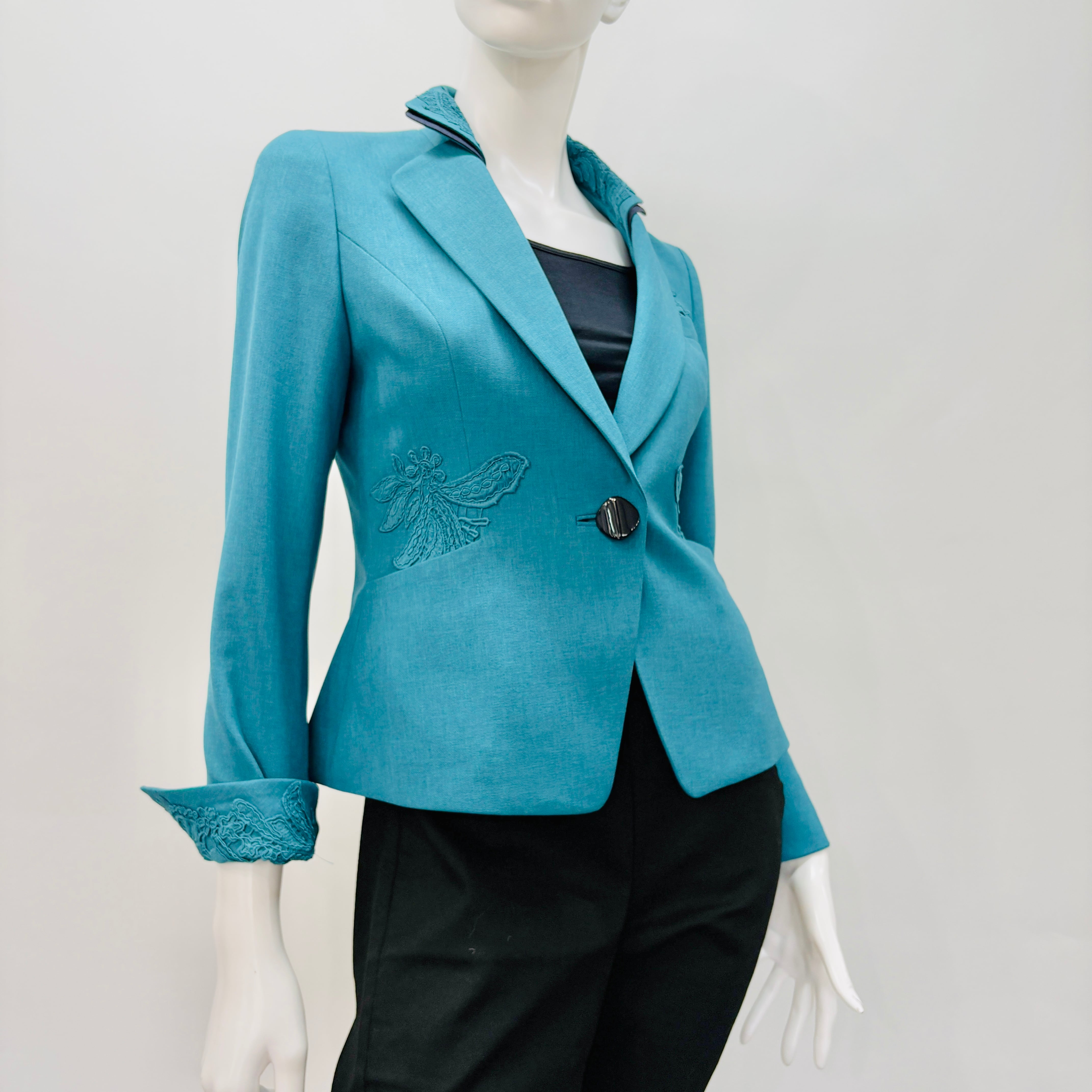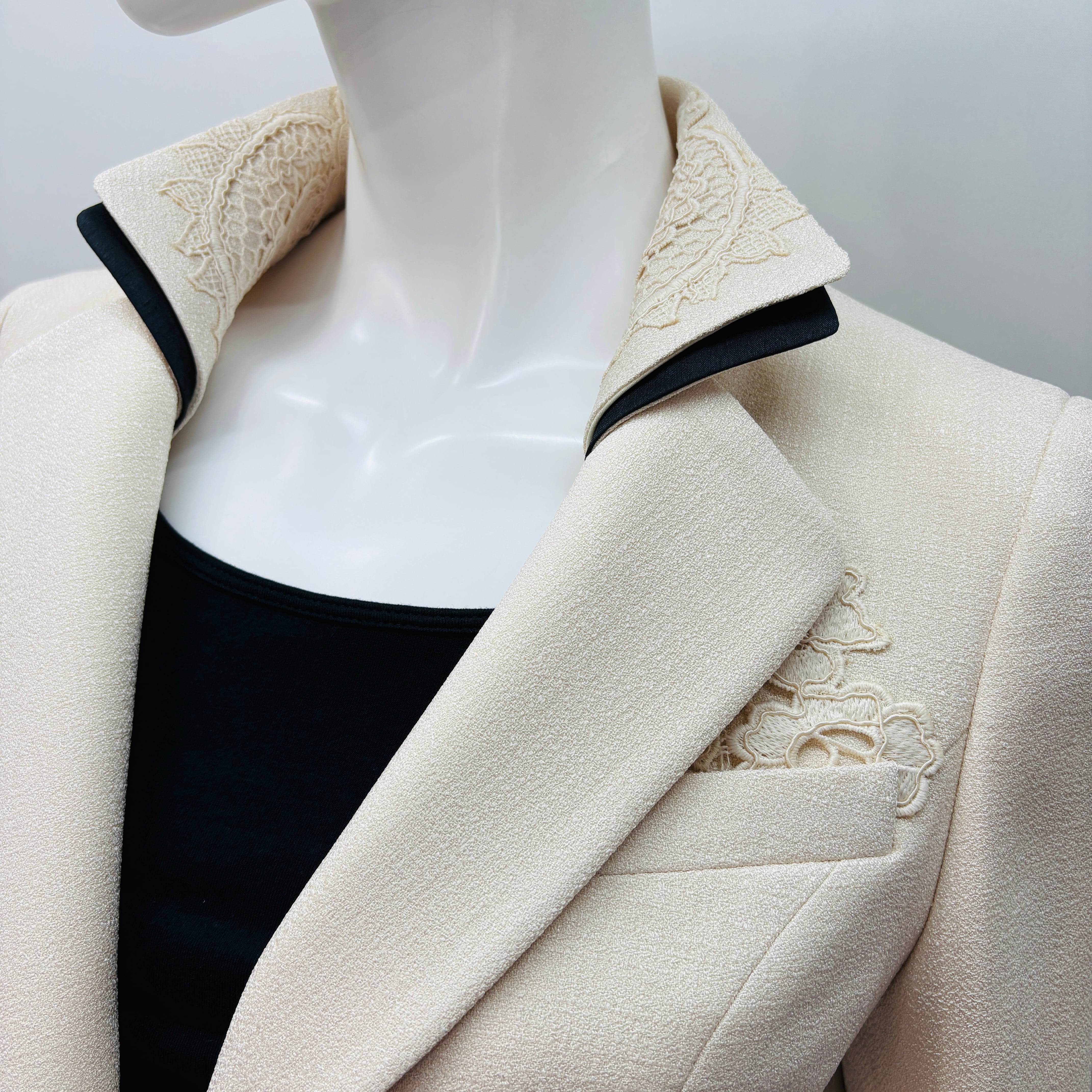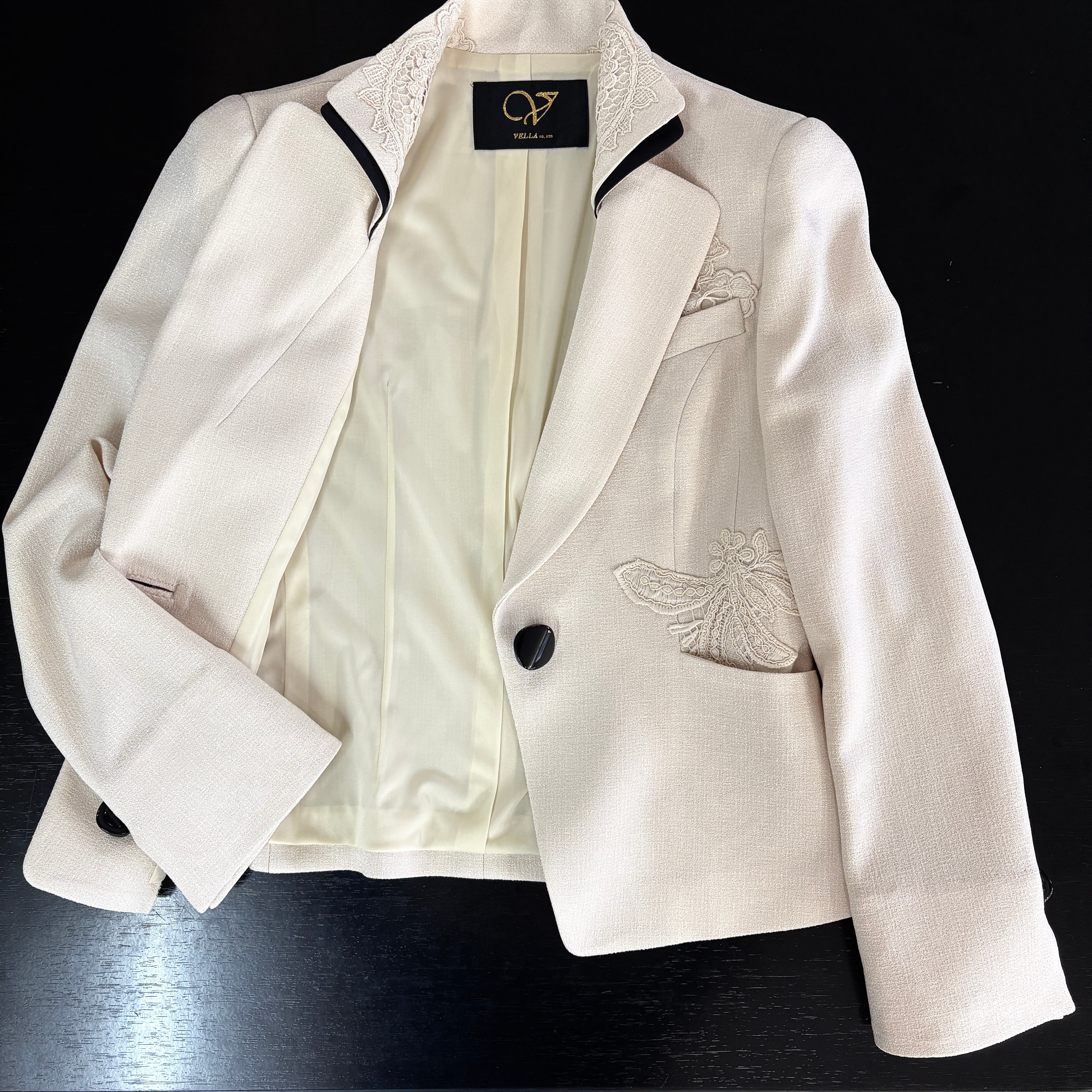 このグリーンジャケットは、同色のレースをあしらった柔らかな印象が魅力です。エレガントな雰囲気を醸し出しながら、どんなコーディネートにも合わせやすい一着です。カジュアルにもフォーマルにも活躍する、シーンを問わない万能なジャケットです!