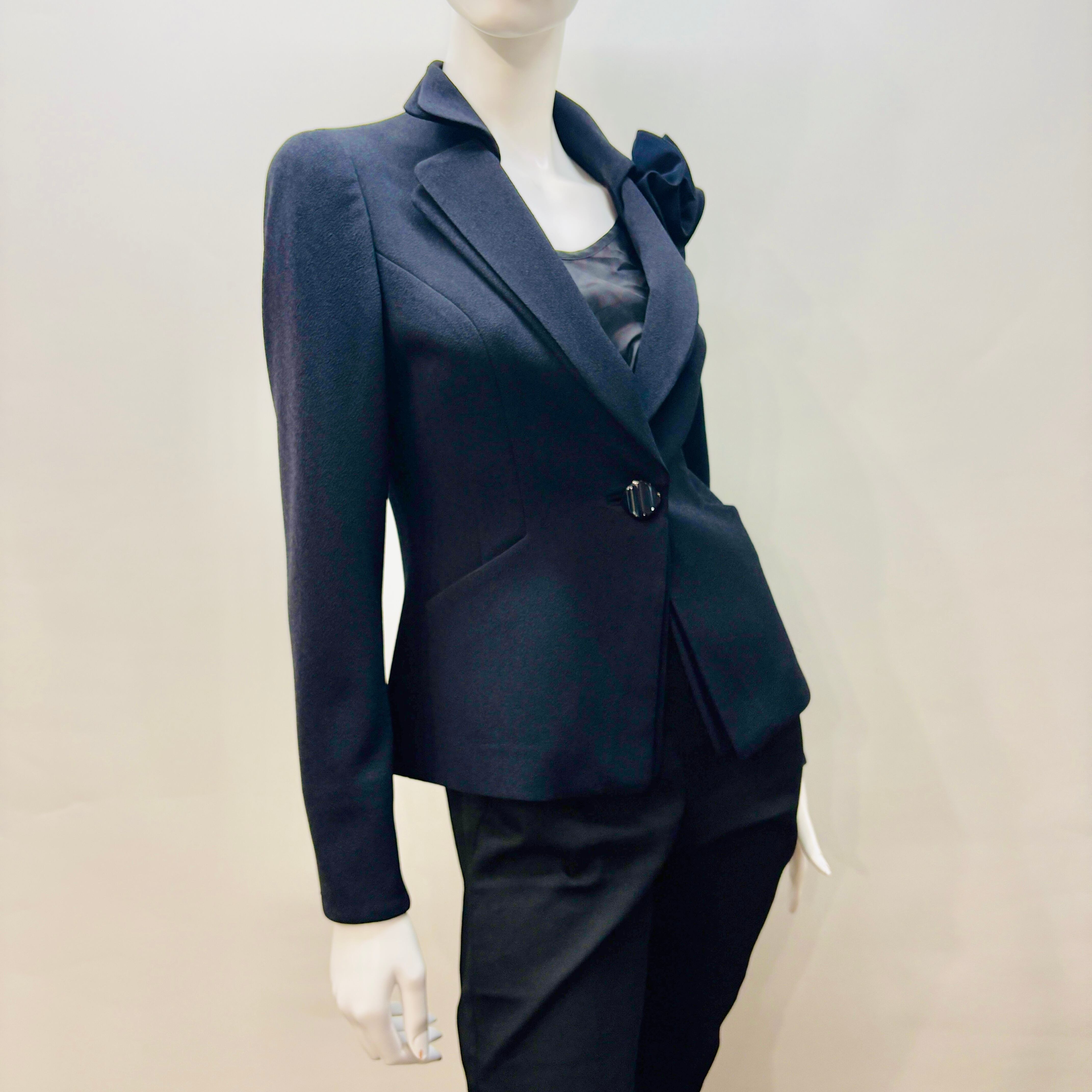 こちらのエレガントなブラックジャケットは、ストレッチ素材を使用しており、着やすさが際立つ一着です。洗練されたデザインは、ビジネスシーンから特別なイベントまで幅広いシーンで活躍します。体にフィットしながらも動きやすさを考慮されており、どなたでも自信を持って着こなせるアイテムです。