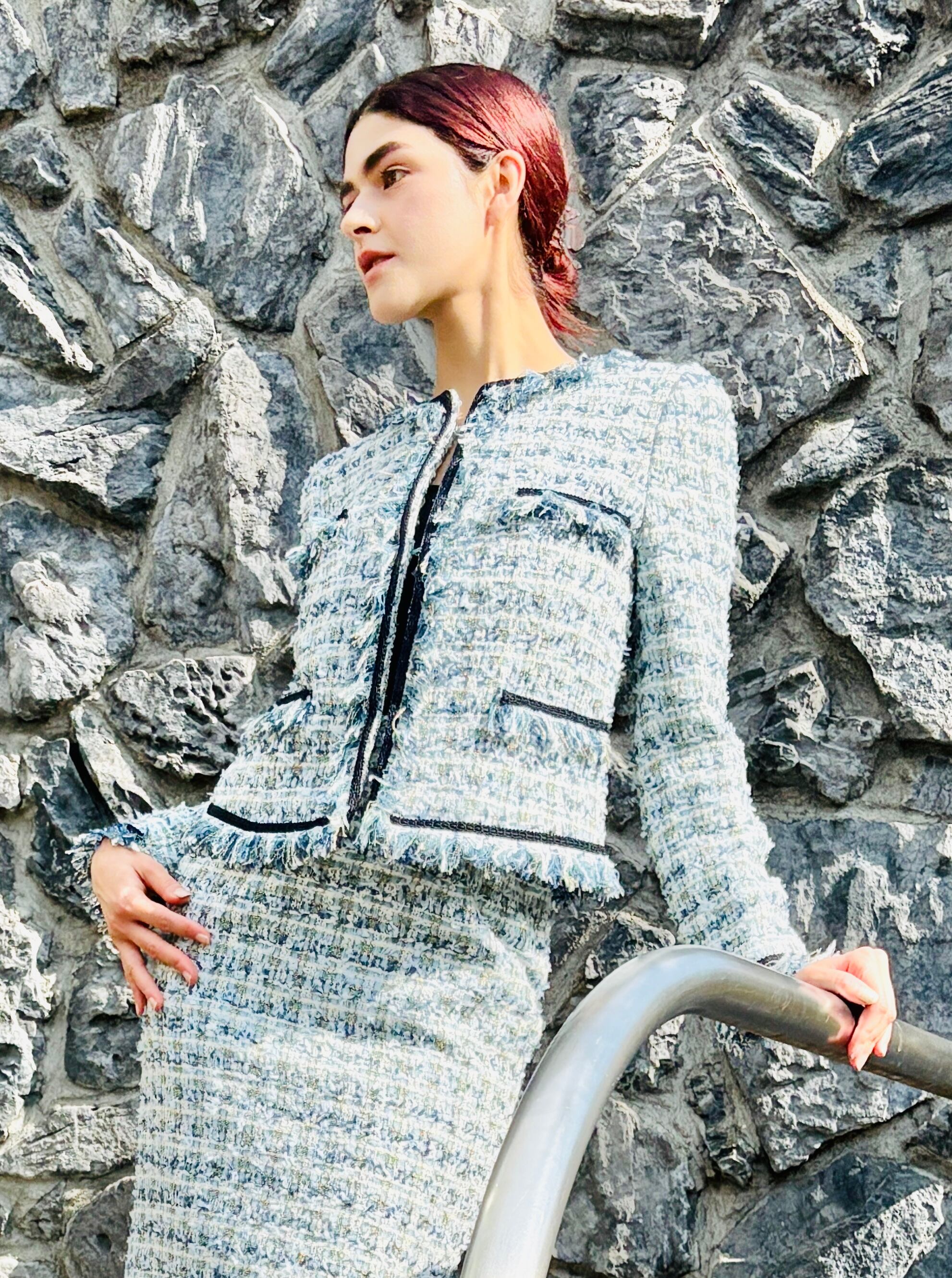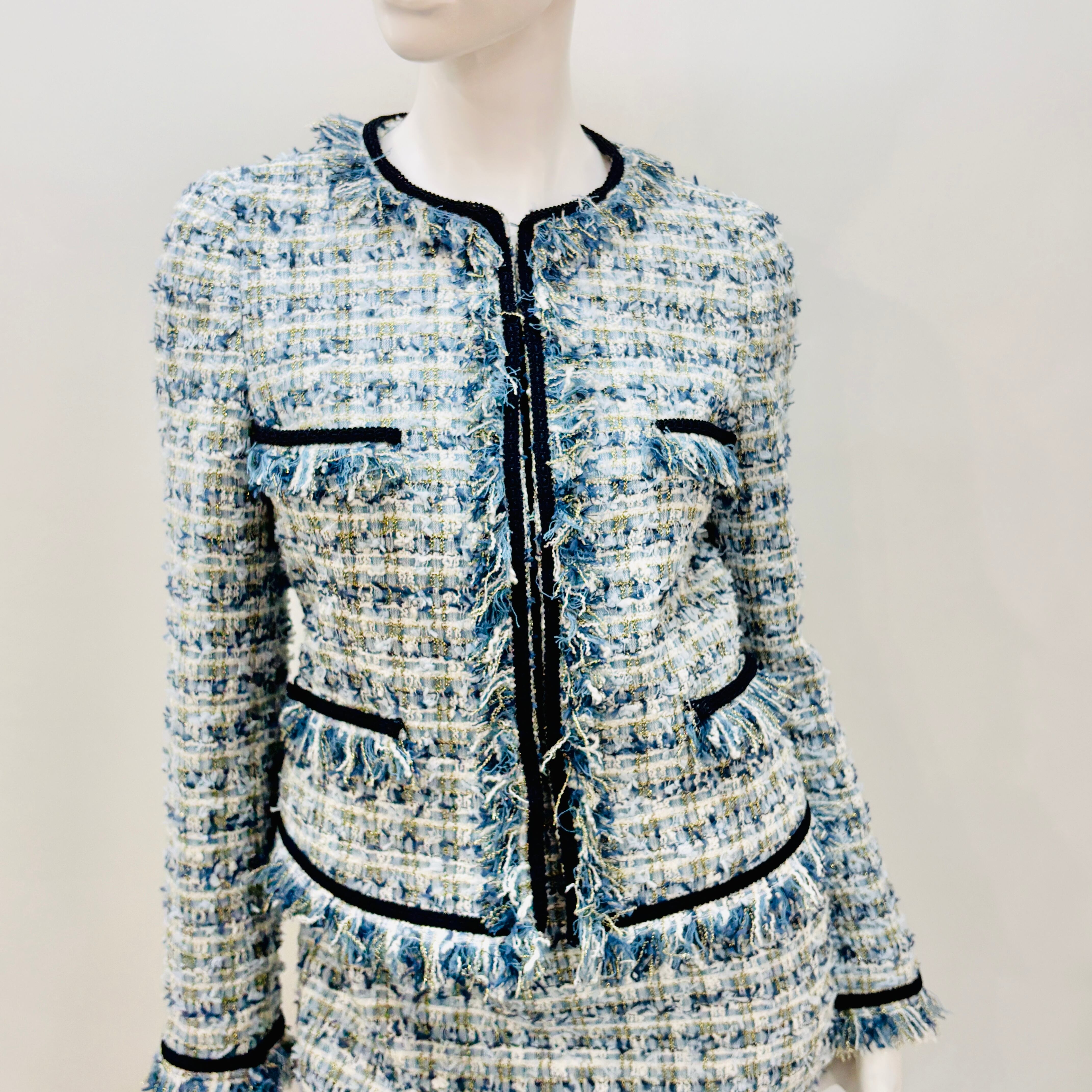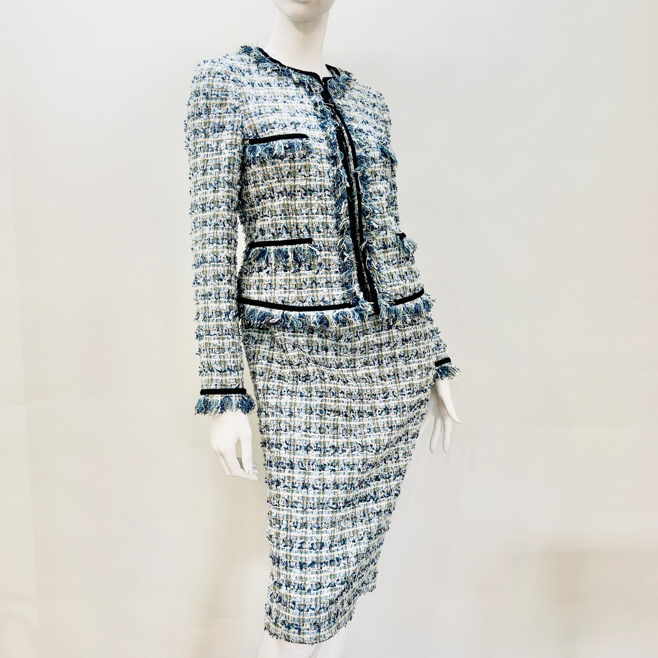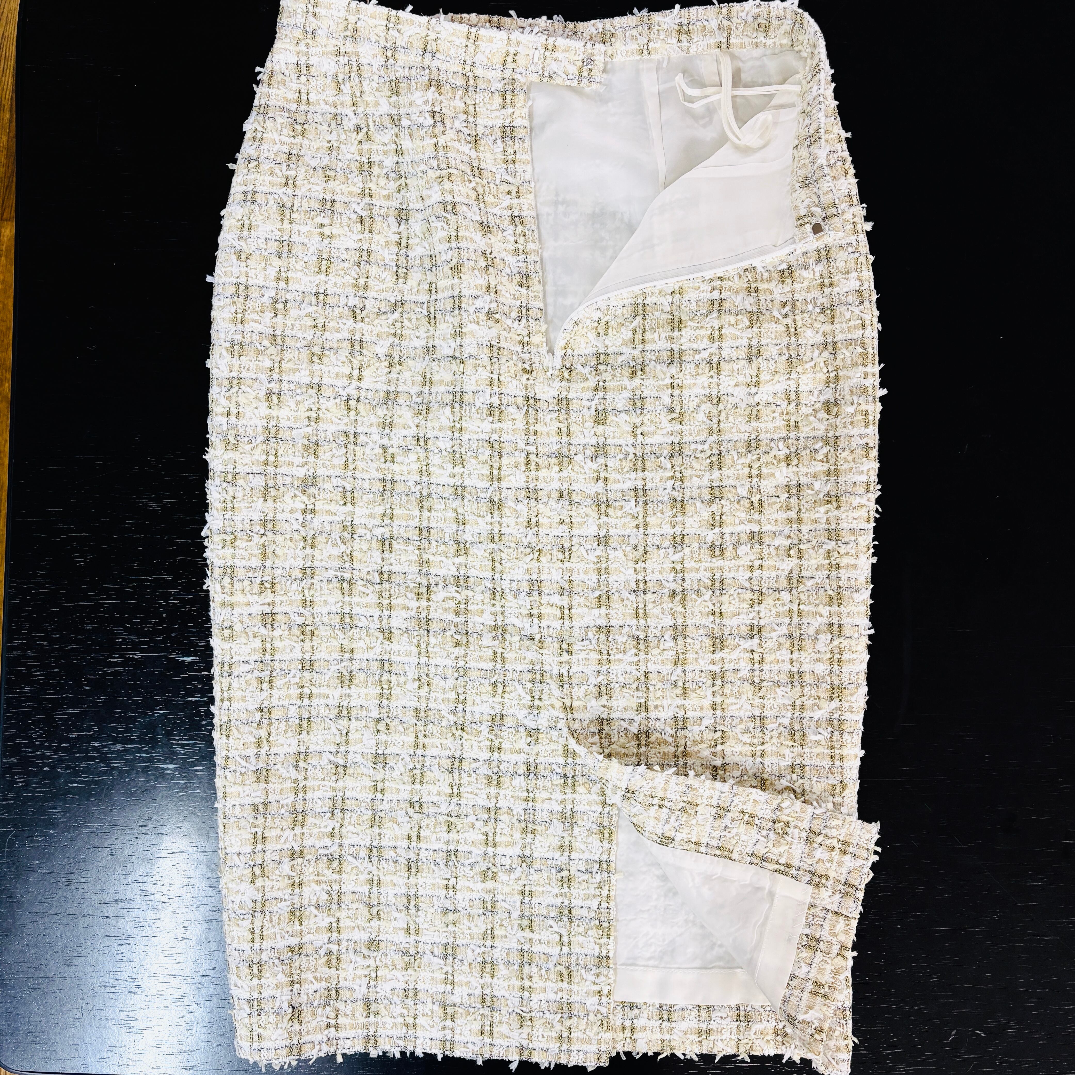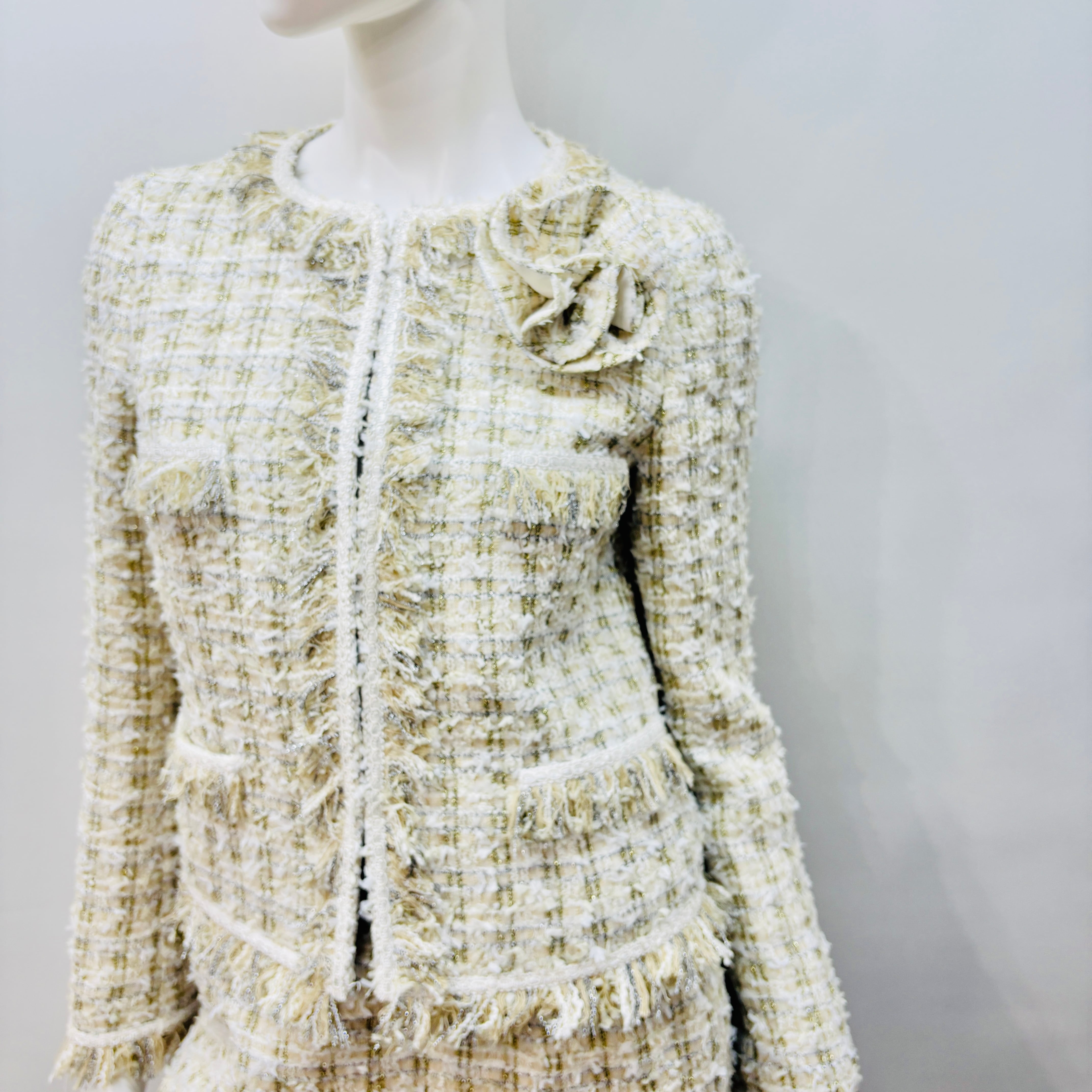 エレガントなツイードスーツが、共地フリンジのディテールで一層魅力的な一品に仕上がりました。スタイリッシュなホワイトは、特別なシーンやフォーマルなお出かけにぴったりです。洗練されたデザインが、着用する方の上品さを引き立て、様々なコーディネートにマッチします!