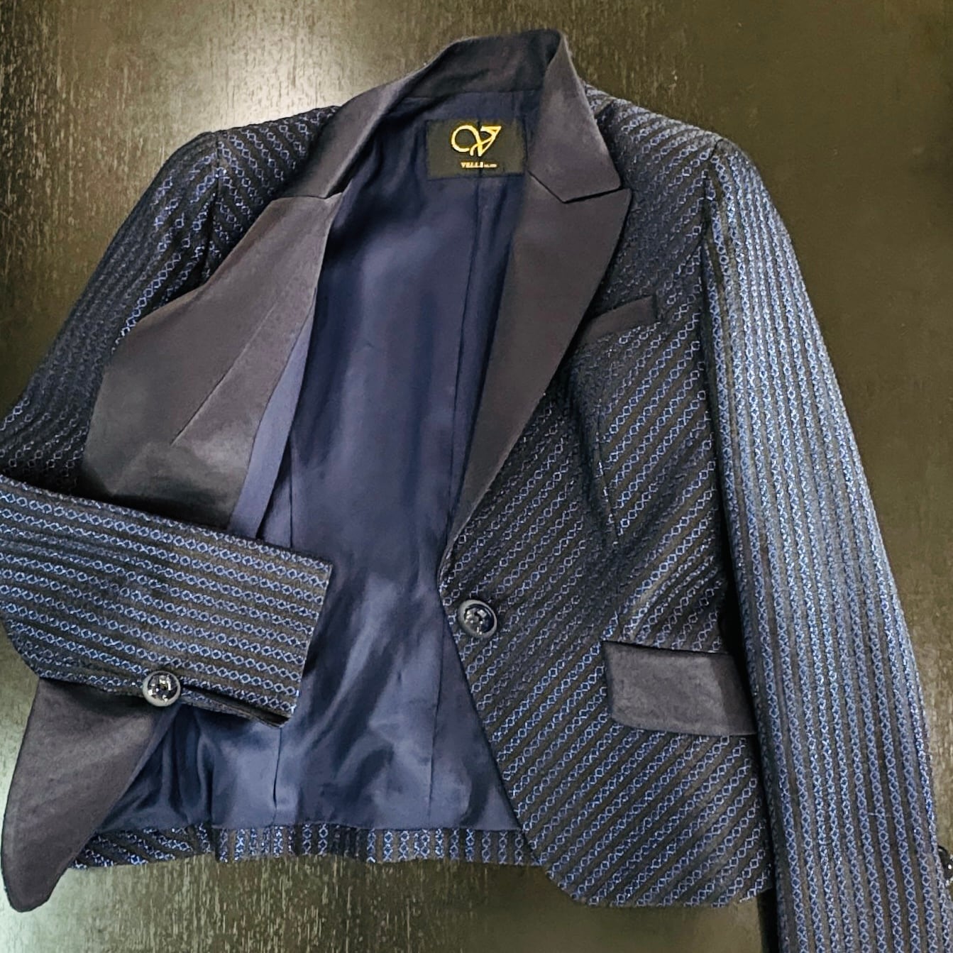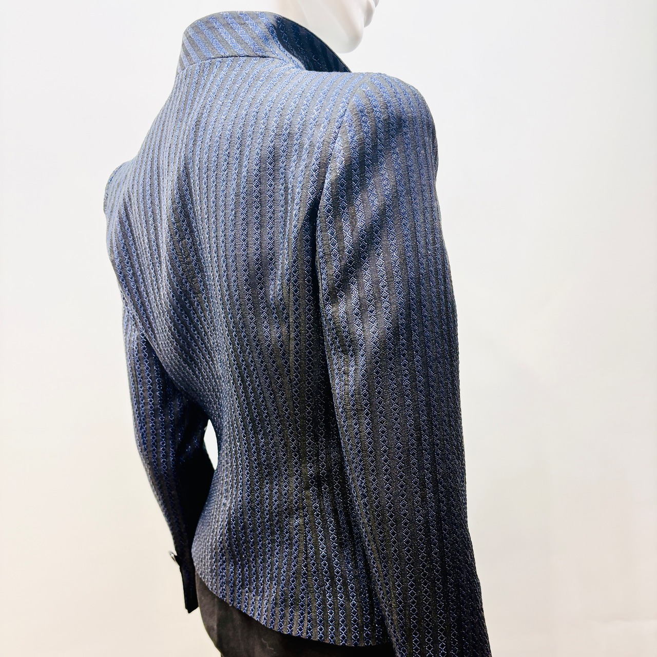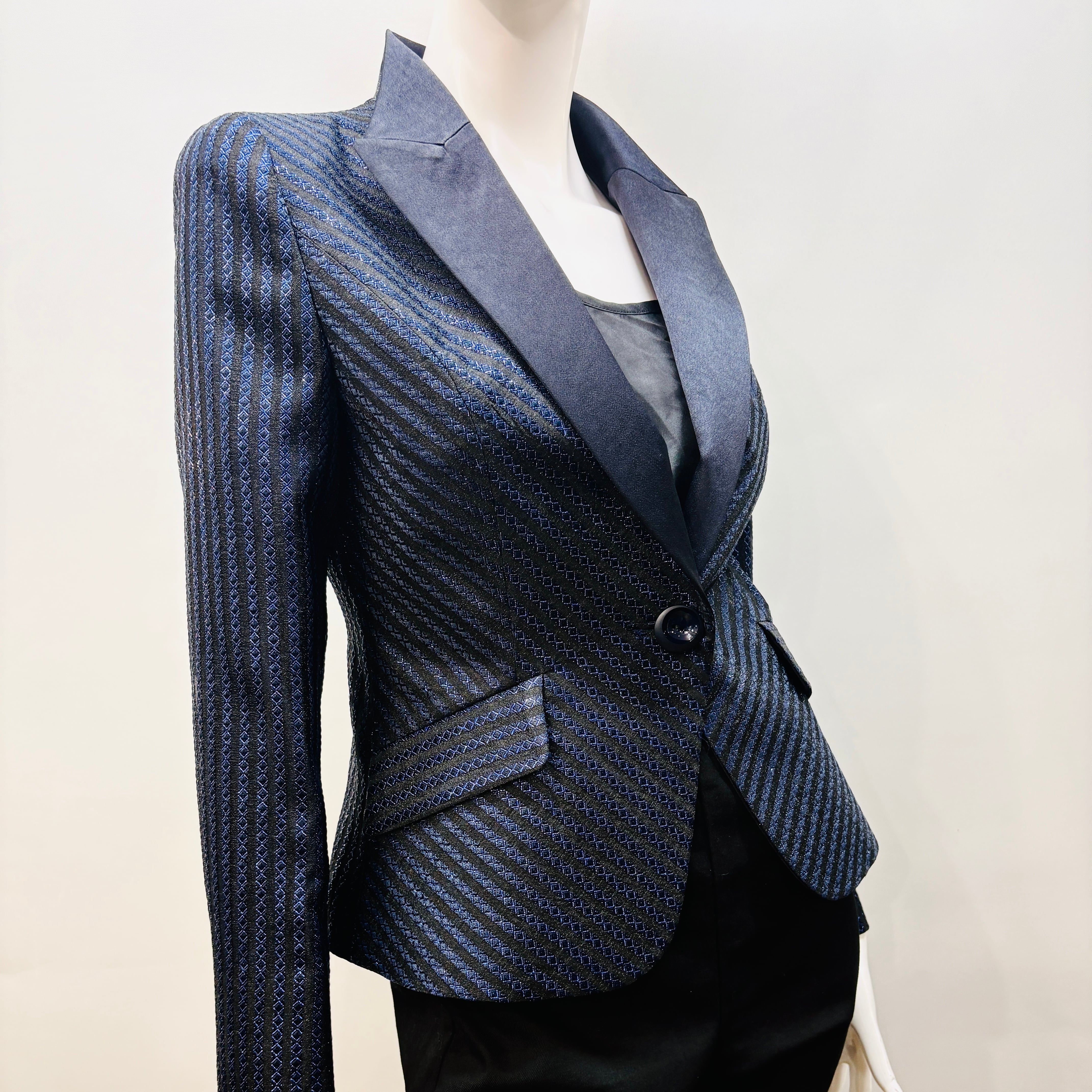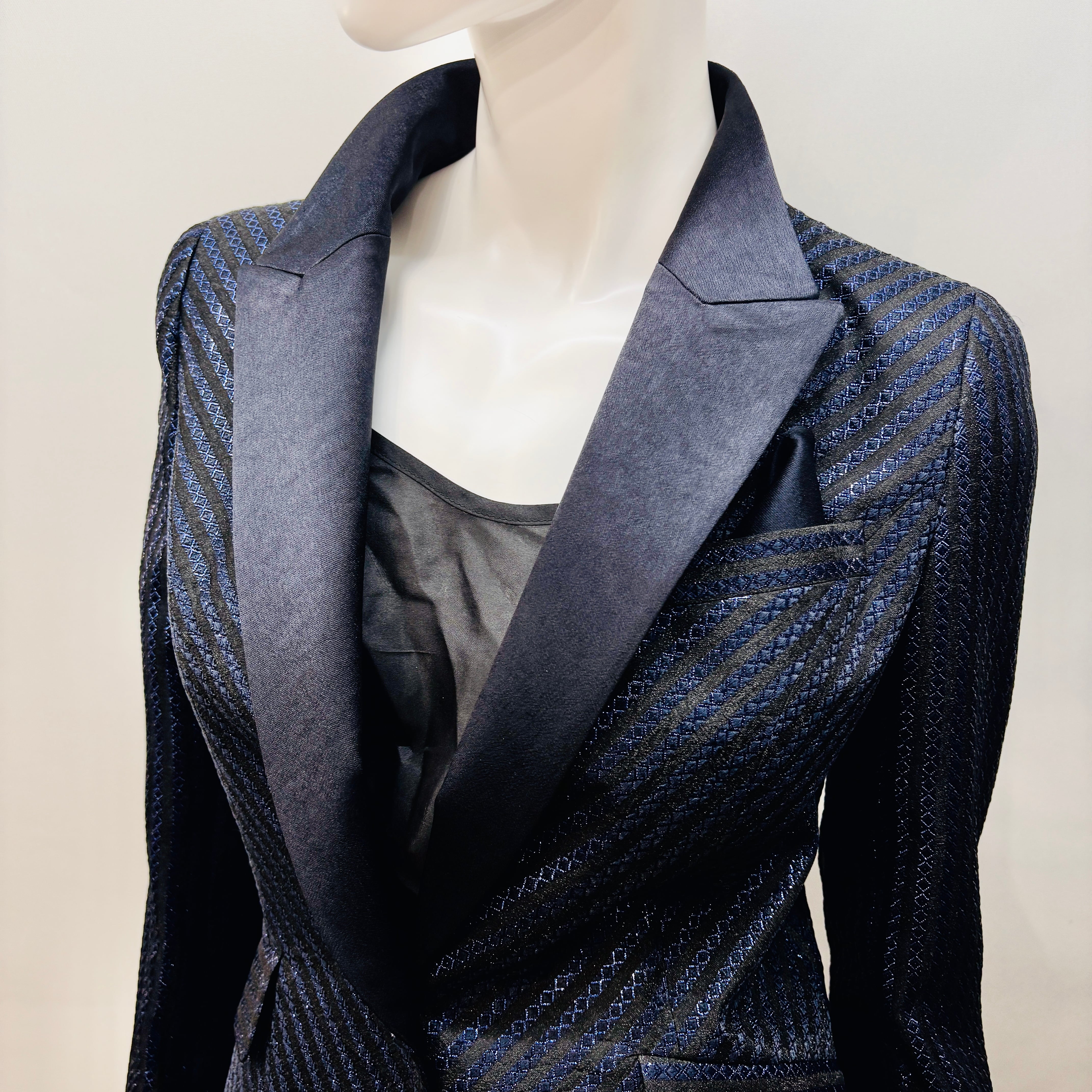 こちらのエレガントなネイビージャケットは、サテン衿の洗練されたデザインが特徴で、上品で華やかな印象を与えます。深みのあるネイビーは、ビジネスシーンや特別なイベントにぴったりで、シルエットの美しさが際立つ一着です。動きやすさも考慮された仕立てで、快適に着用いただけます!
