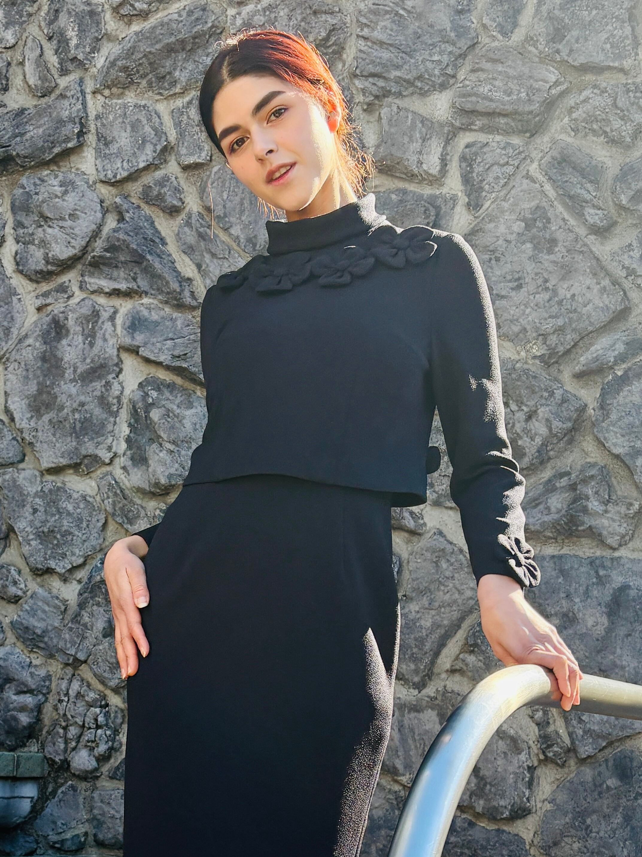 エレガントなデザインの長袖ワンピース。デイリーから特別な日まで幅広く活躍する一着です。同素材で作られたお花のモチーフが、柔らかな印象を与え、女性らしさを引き立ててくれます。