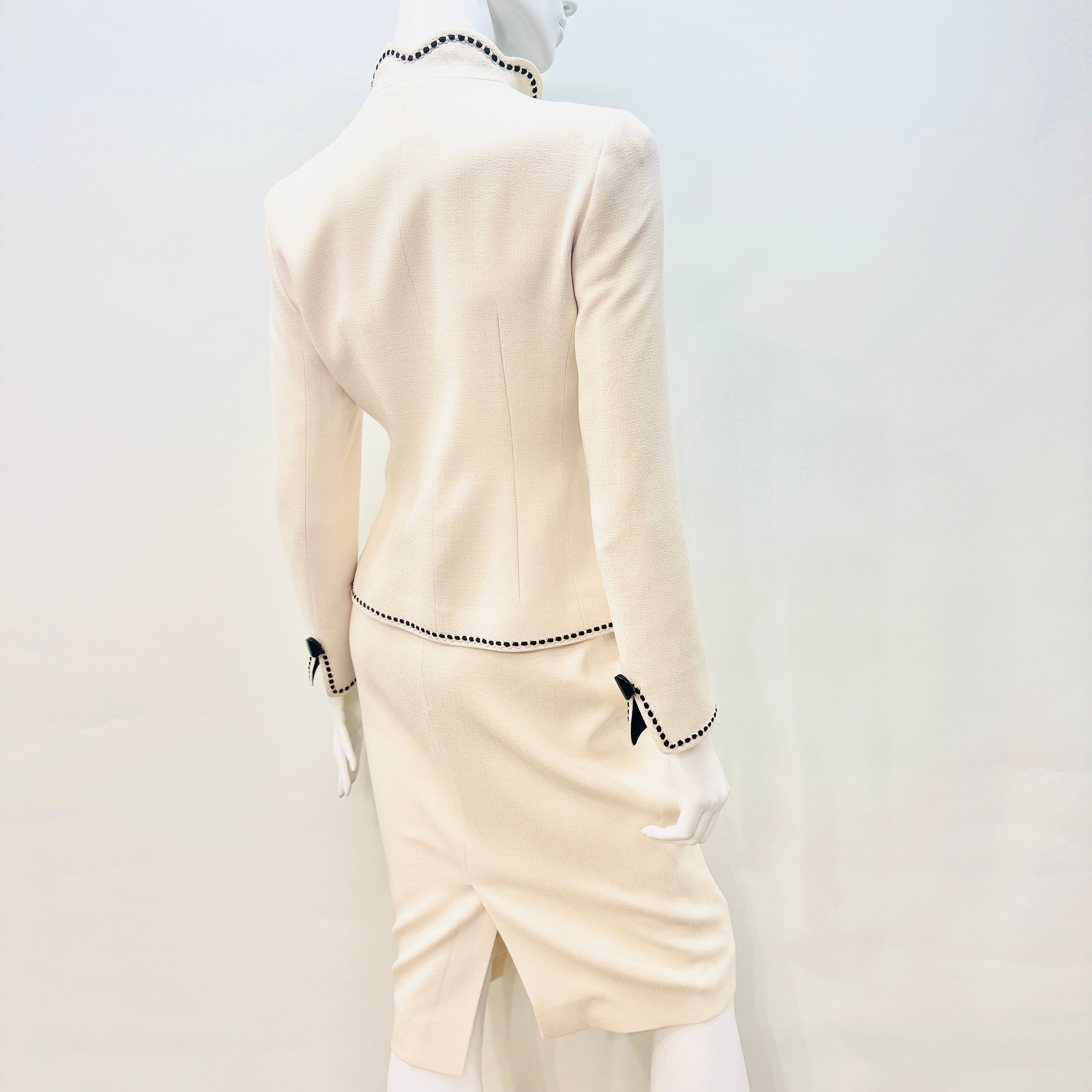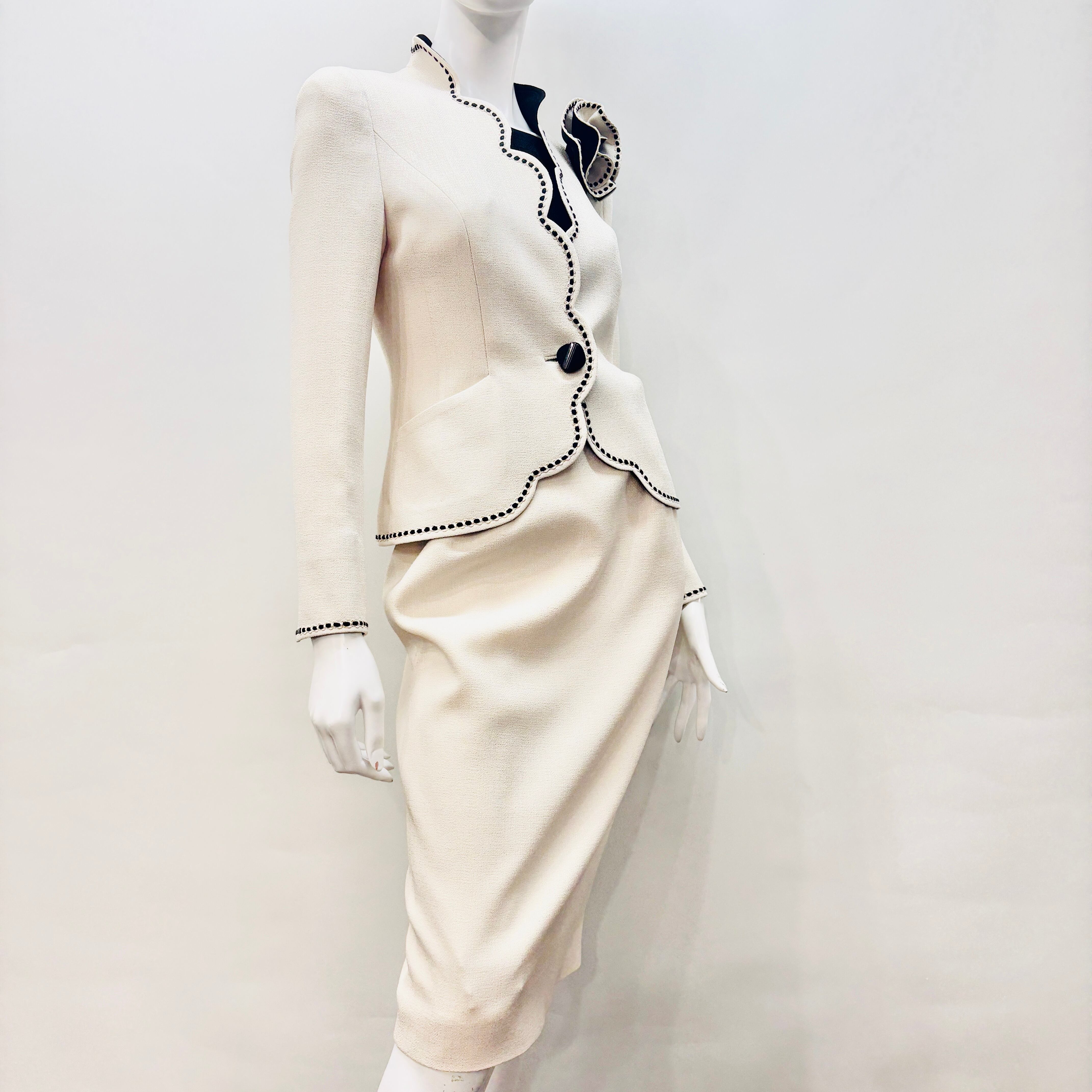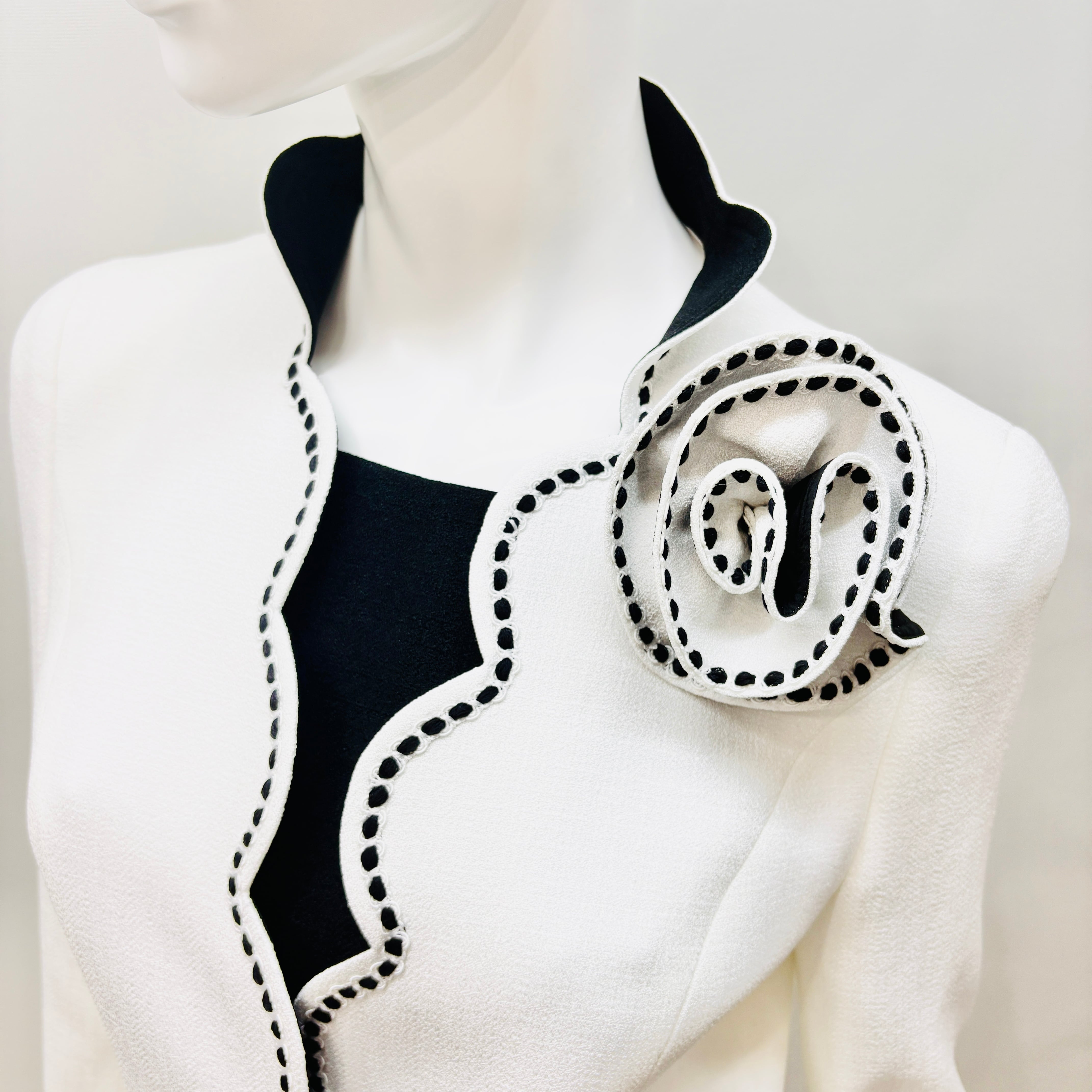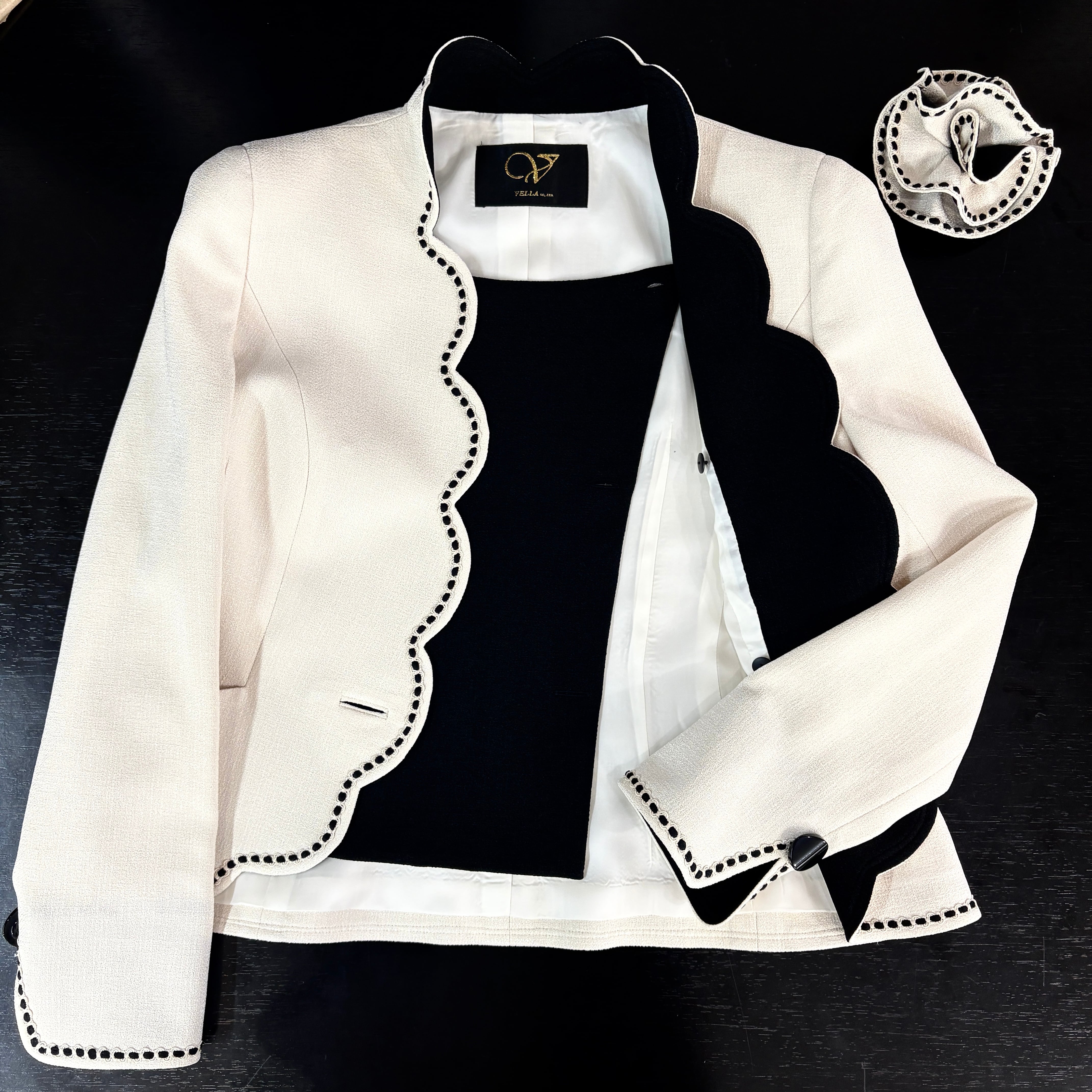 エレガントな雰囲気を醸し出すホワイトスカラップスーツ。配色のブレードが巧みにアクセントとなっており、洗練されたスタイルを演出します。淡いカラーリングが特別な日にもふさわしい一着で、フォーマルからカジュアルまで幅広いシーンでお使いいただけます。スカラップデザインは、女性らしさを引き立て、上品に着こなすことができる魅力的なアイテムです!