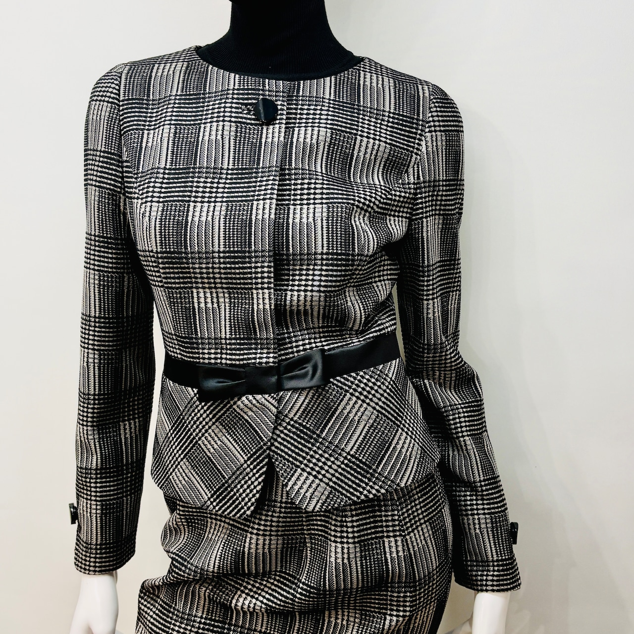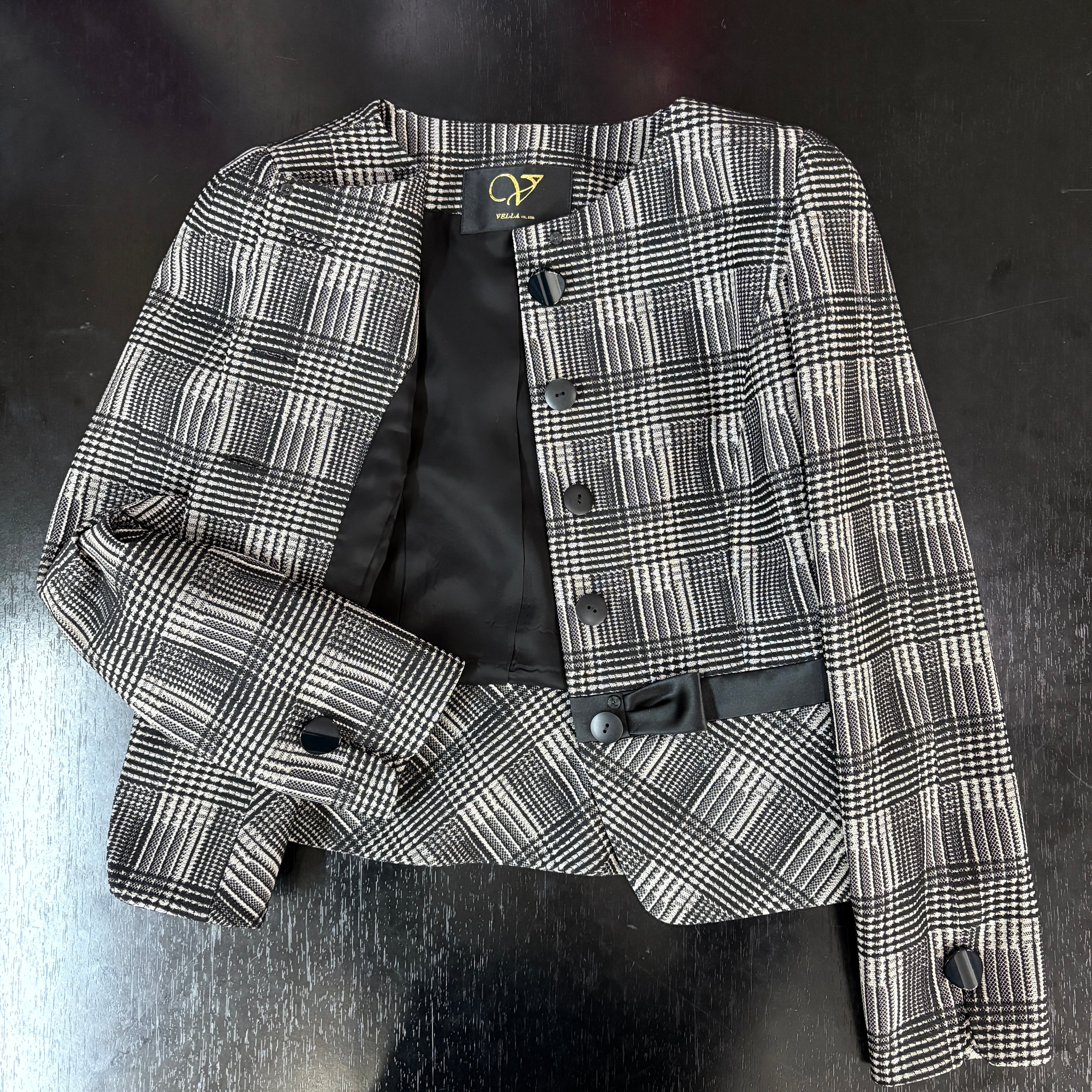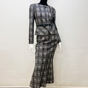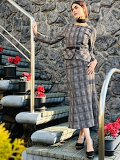エレガントなスタイルを演出するブラウン×ブラックのチェック柄スーツ。ウエストには配色のリボンが添えられ、華やかさをプラスしています。フレアースカートのデザインは、しなやかな動きを生み出し、特別な場面から日常のおしゃれまで、幅広いシーンで活躍する一着です。洗練されたチェック柄が、女性らしさを引き立てる魅力的なアイテムです!