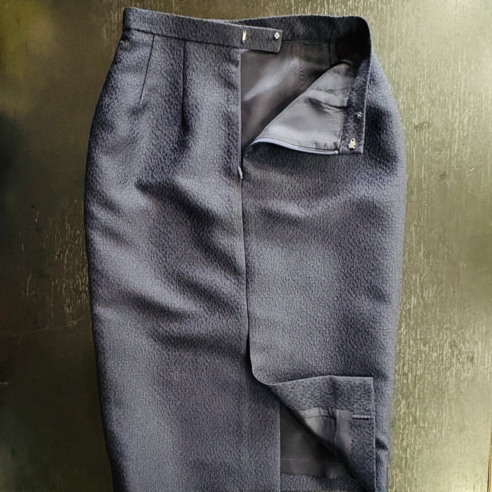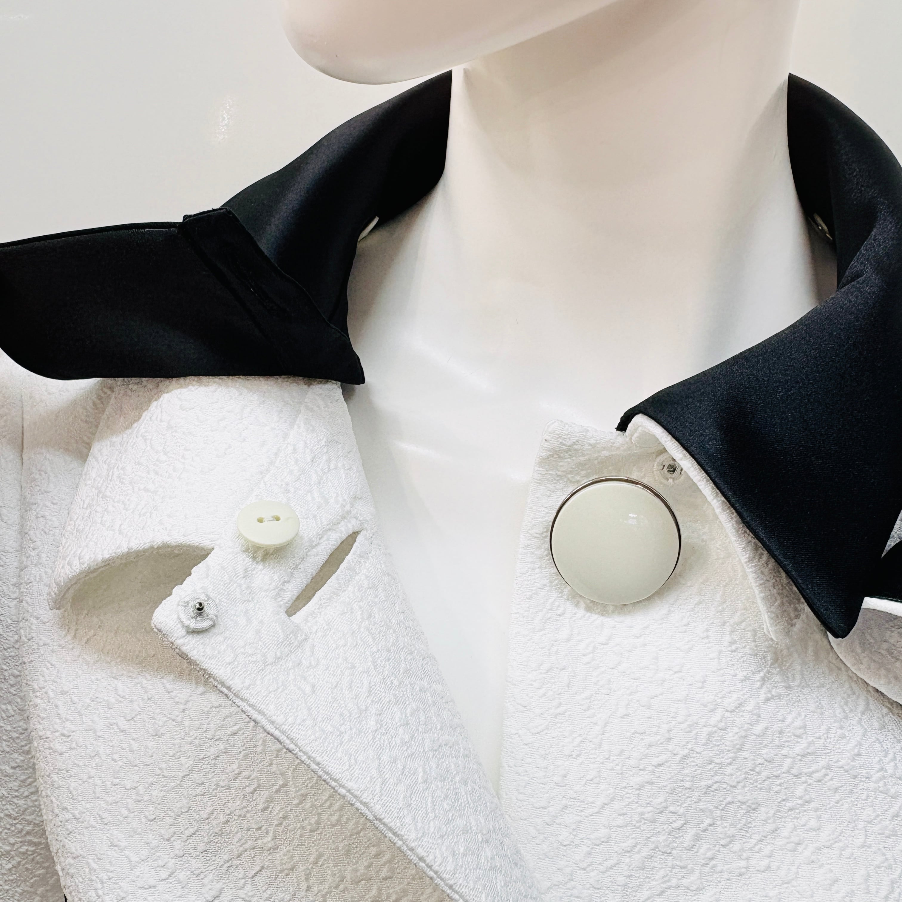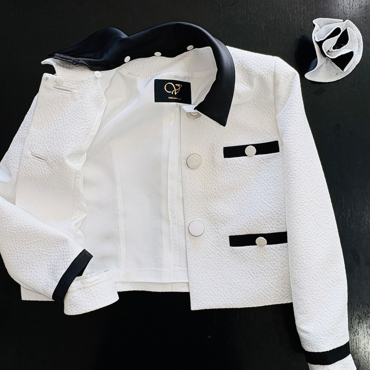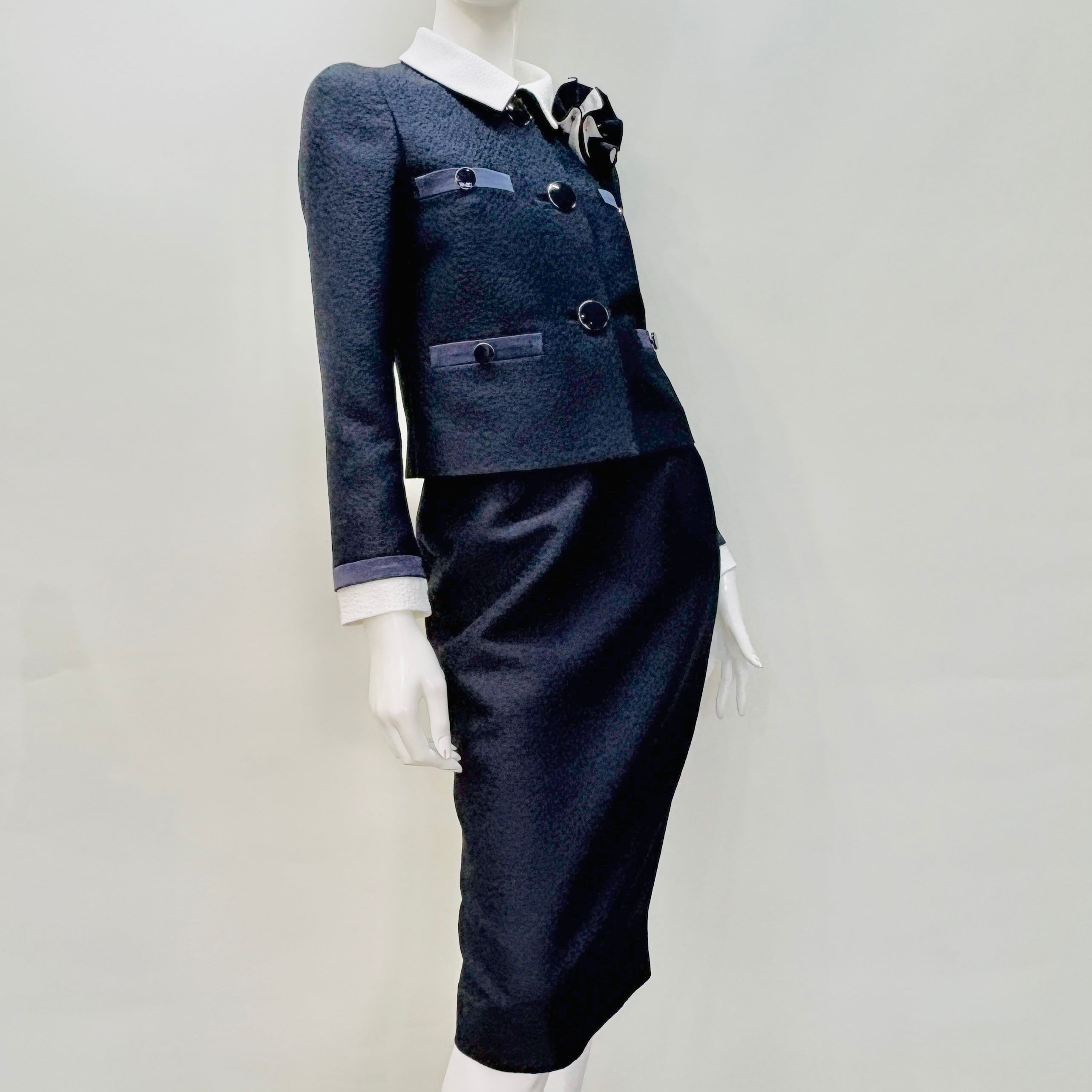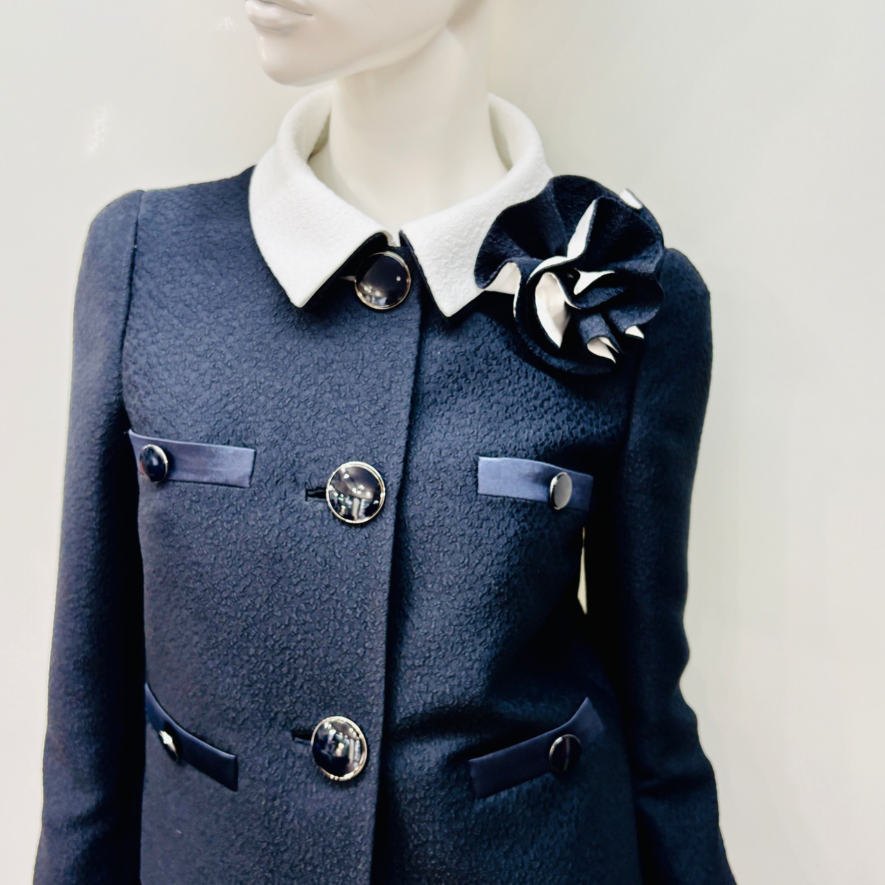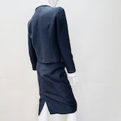 エレガントさと洗練を兼ね備えたネイビーのシャネルスーツ。スペアカラーとカフスに施されたホワイトのアクセントが、全体のデザインを引き立て、シンプルながらも上品な印象を与えます。特別な場面はもちろん、日常のおしゃれにもぴったりな一着です。女性らしさを際立たせ、スタイリッシュな魅力を放つアイテムとなっています!