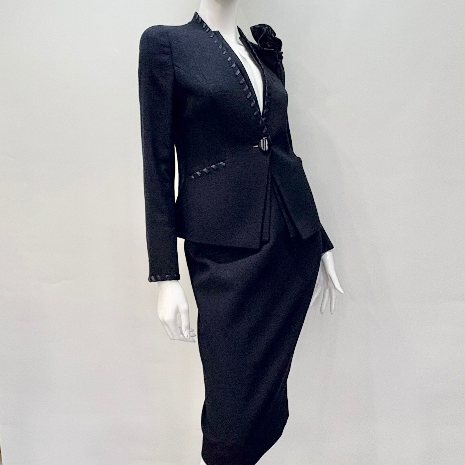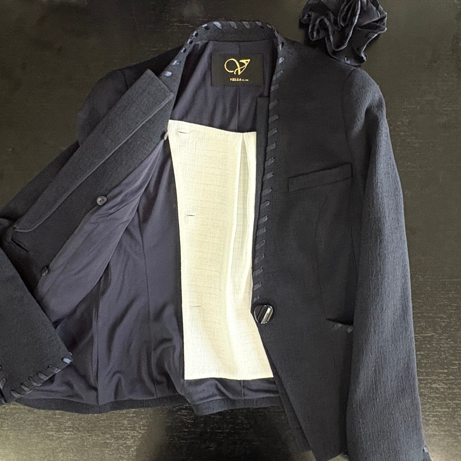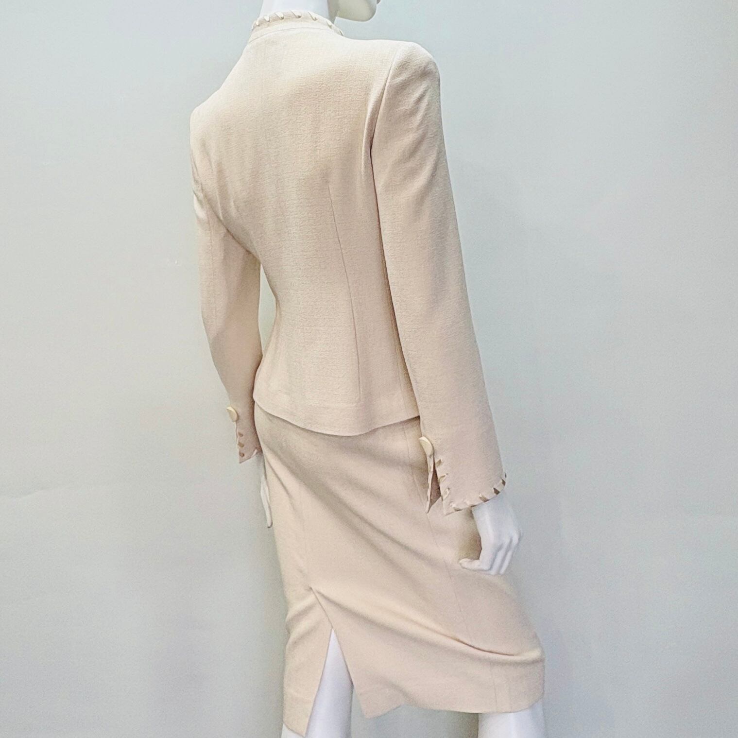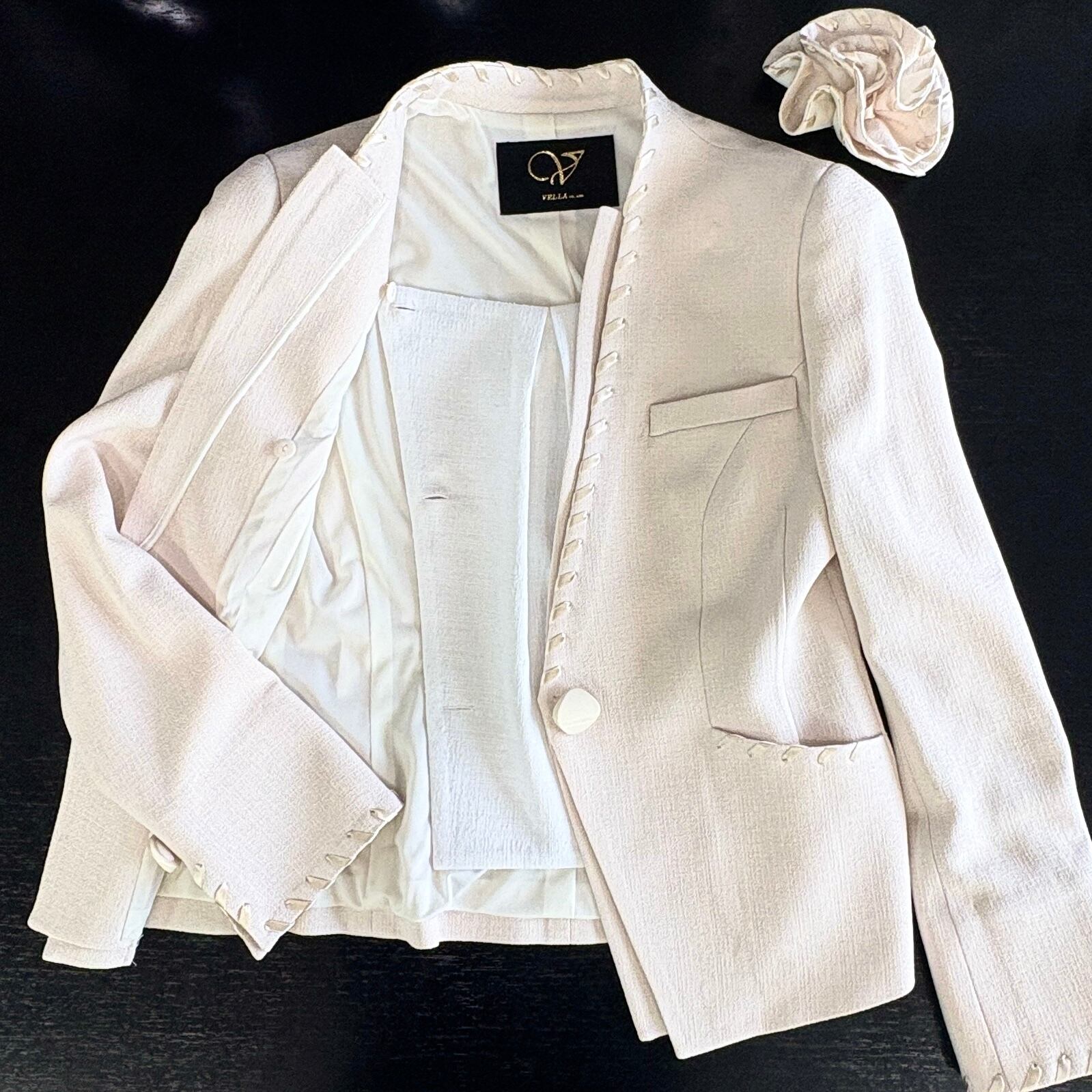 エレガントな雰囲気を醸し出すベージュのベーシックスーツ。衿、ポケット口、袖口に施された同色のリボンが、シンプルながらも洗練された印象を与え、おしゃれを楽しむ女性にぴったりのアイテムです。どんなシーンでも自然に溶け込み、特別な場所でも日常使いでも活躍する理想的な一着です!