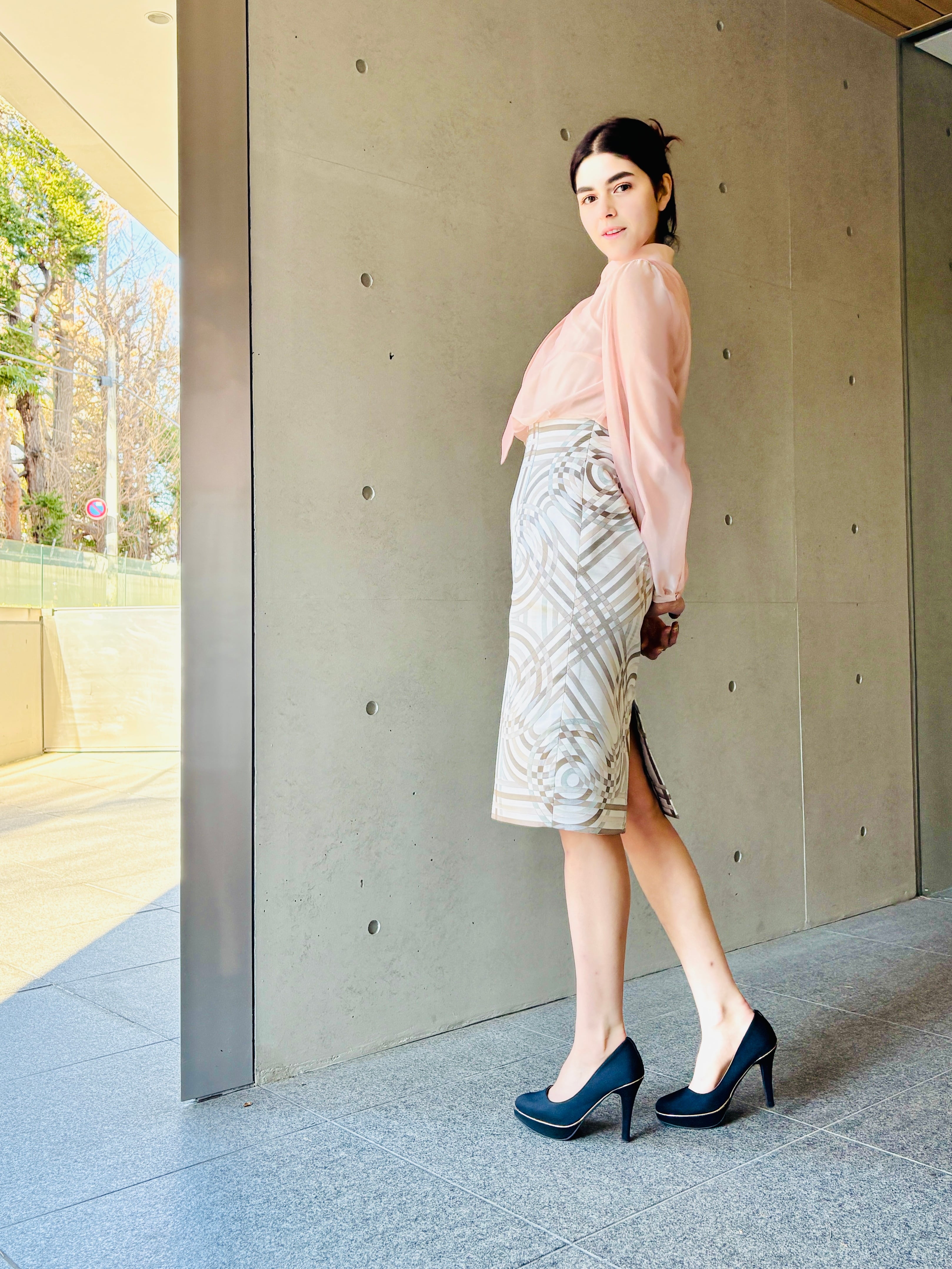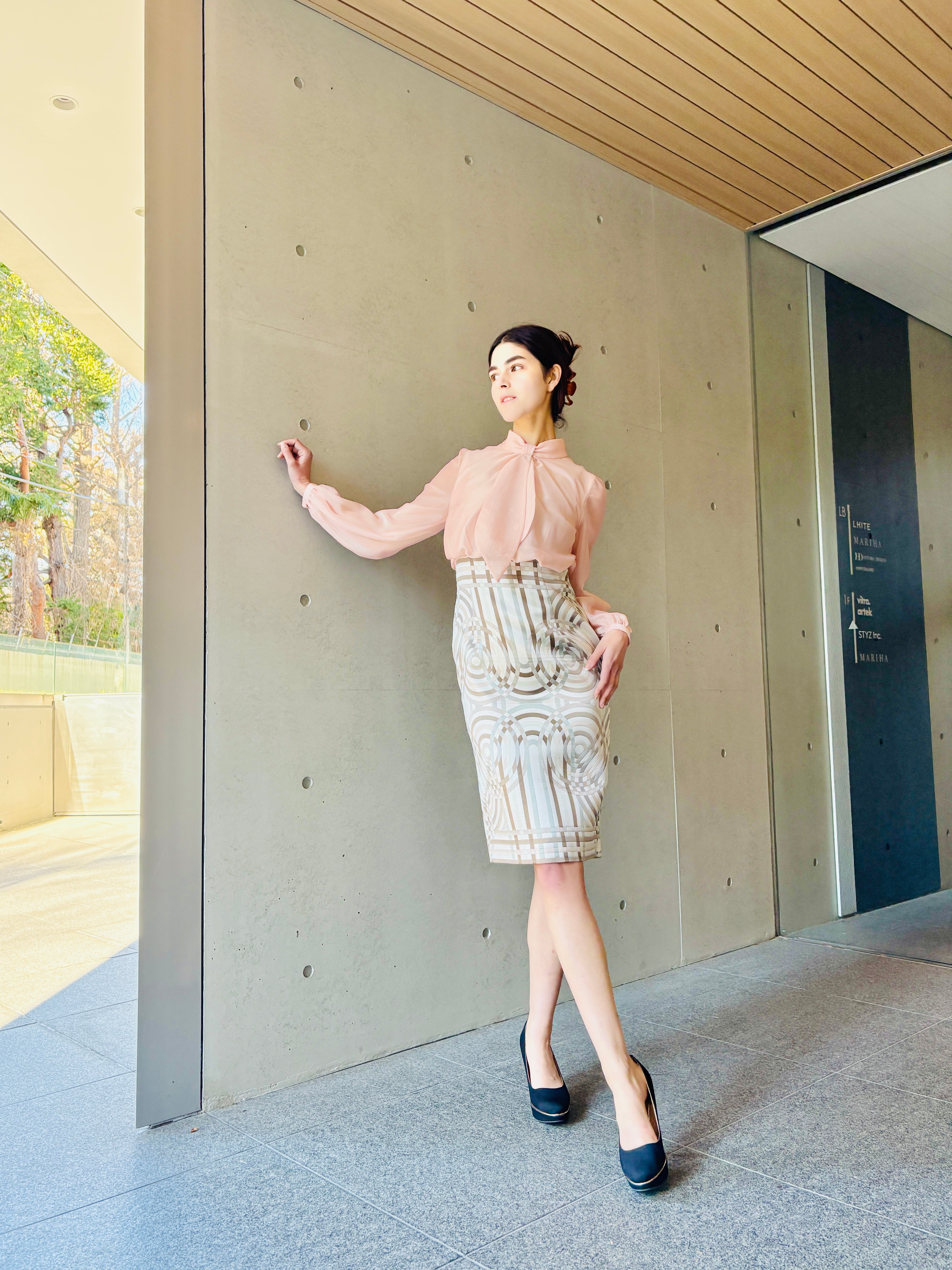 スカート部分にはシルクの織柄が施されており、光に当たるたびに美しい輝きを放ちます。