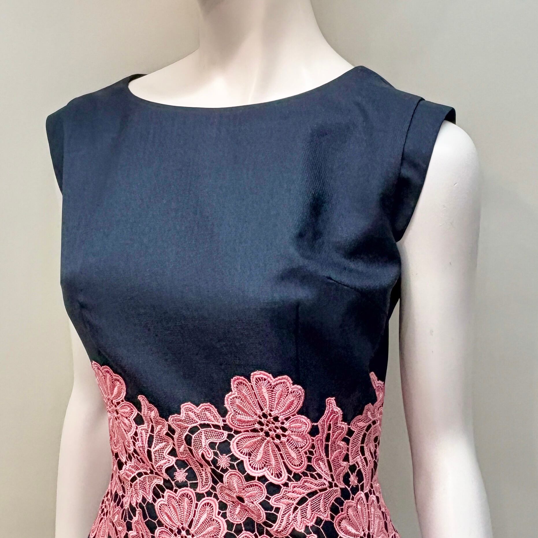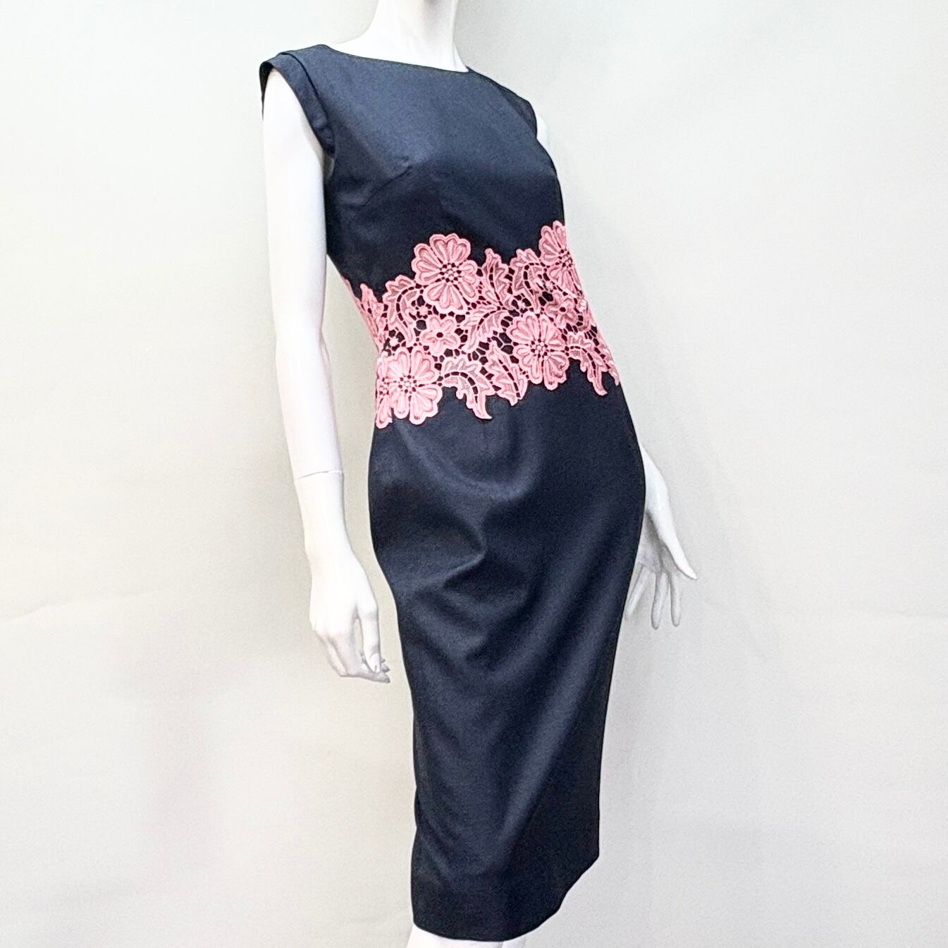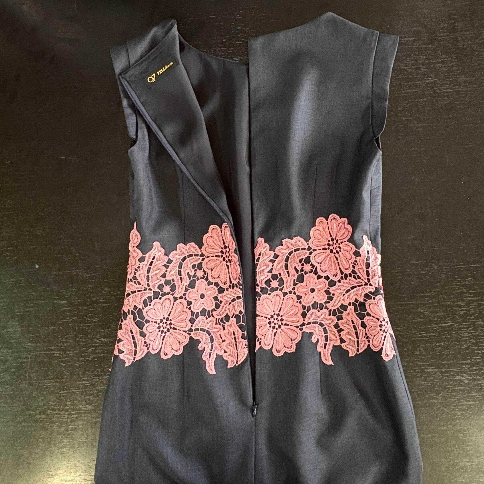 ウエストにあしらったピンクのレースが、シックなネイビーに華やかなアクセントを与えています。上質な素材と巧みなデザインが融合し、特別な日やカジュアルなお出かけなど様々なシーンで活躍します。着心地の良さと洗練されたスタイルが見事に調和した、皆様にぜひお試しいただきたい一着です!