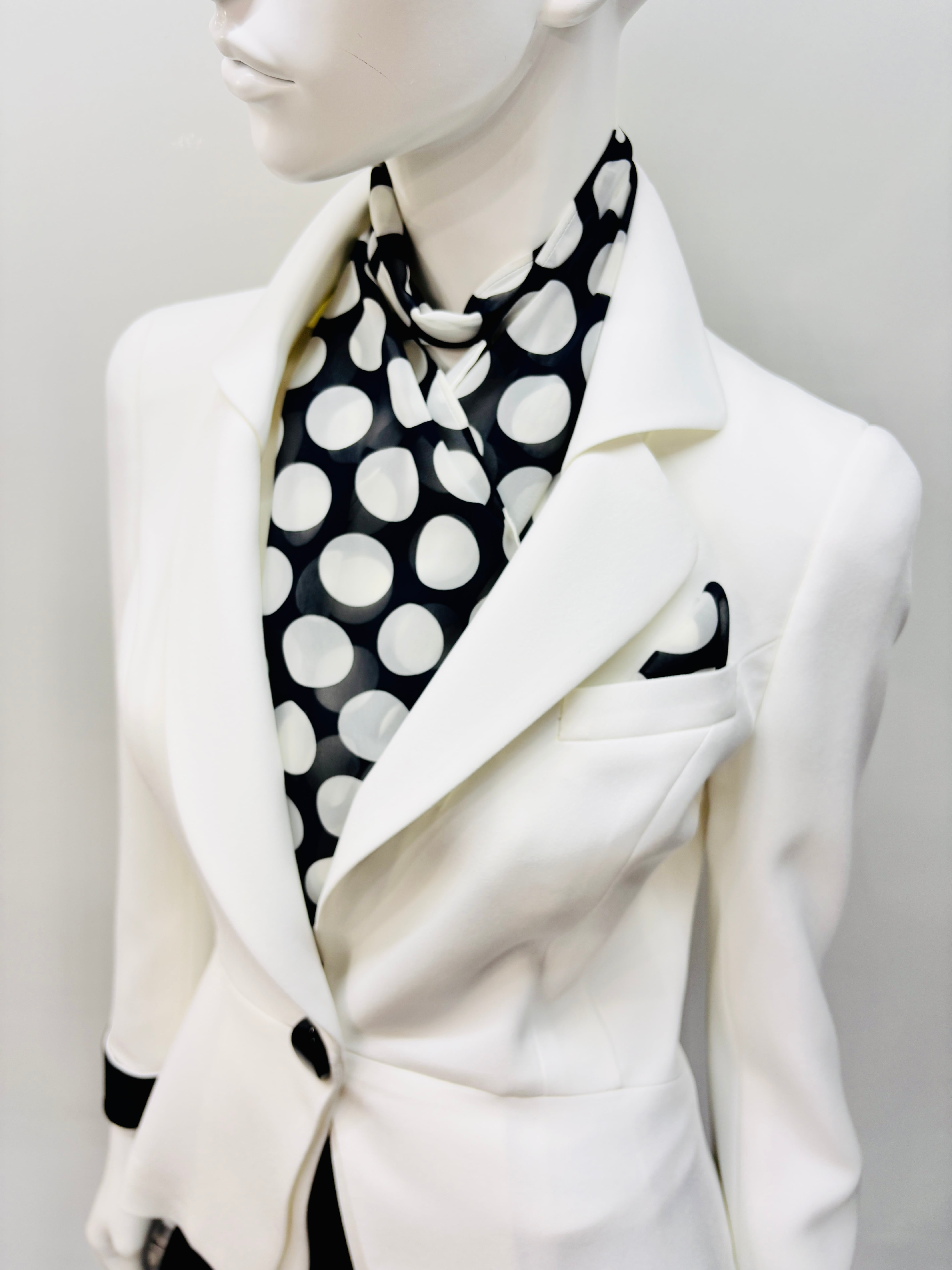 袖口見返しにあしらわれた配色の紺が、清潔感溢れるホワイトジャケットにアクセントを加えています。さらに、ドットのストールを添えて、洗練された印象を演出。高品質な素材と独自のデザインが融合し、フォーマルなイベントからカジュアルなお出かけまで、様々なシーンで活躍するアイテムです。着心地の良さとスタイルの良さが見事に調和した、一度は手に取っていただきたい一着です!