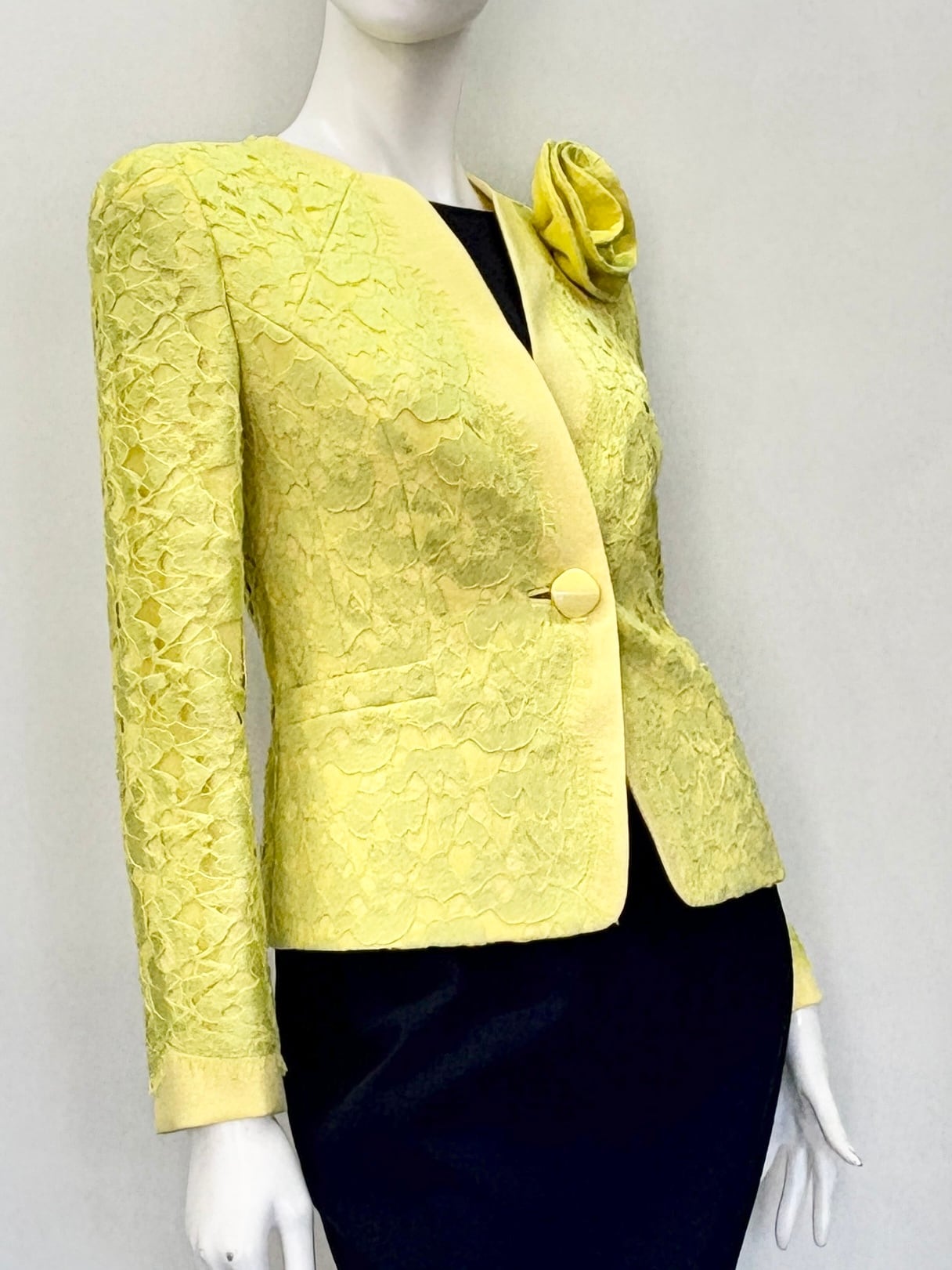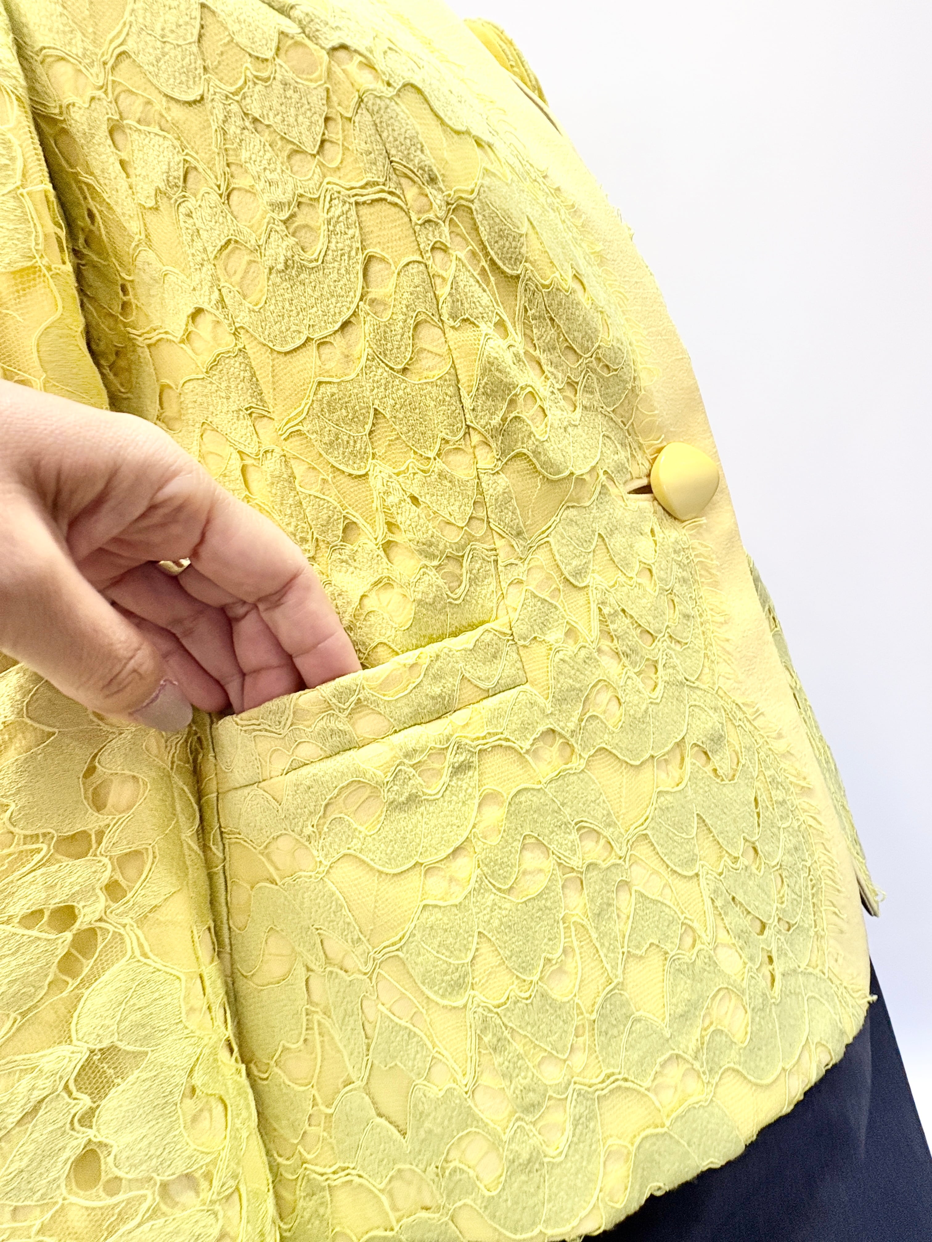 このジャケットは、ノーカラーのデザインが特徴で、エレガントな印象を与えるイエローレースが魅力です。軽やかな素材感が心地よい着心地を実現し、カジュアルなシーンから特別なイベントまで幅広くご活用いただけるアイテムです。着用することで、華やかさをプラスした素敵なスタイルを楽しめる一着を、ぜひお試しください!