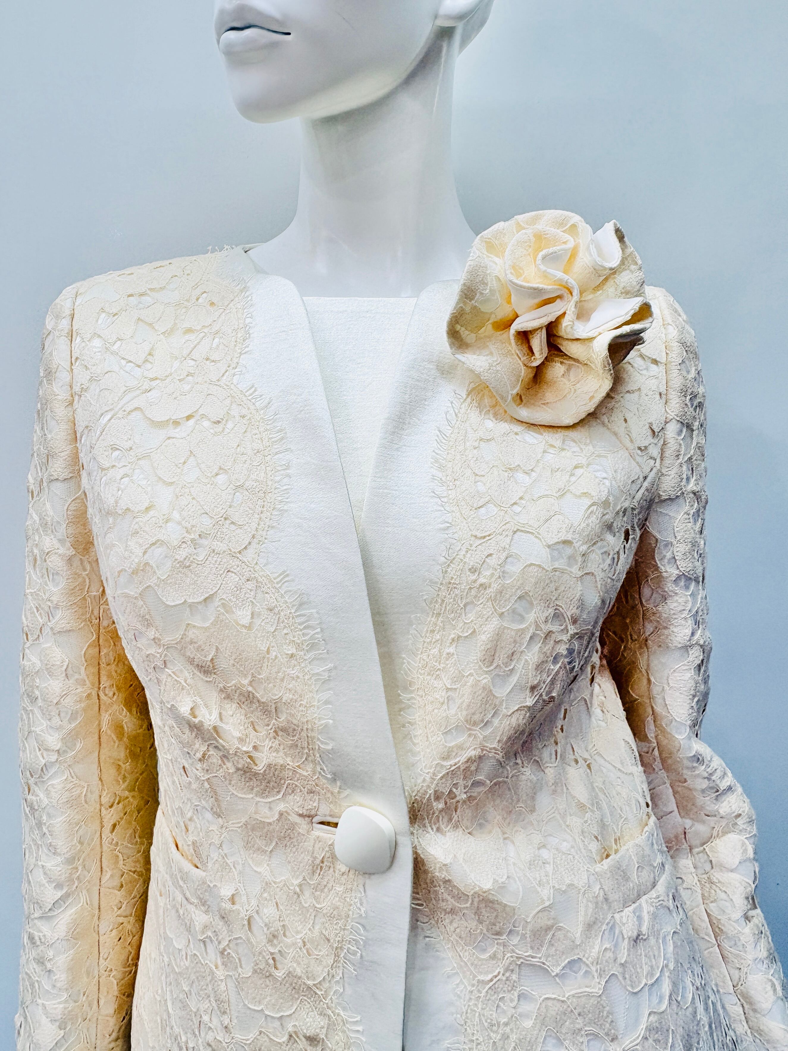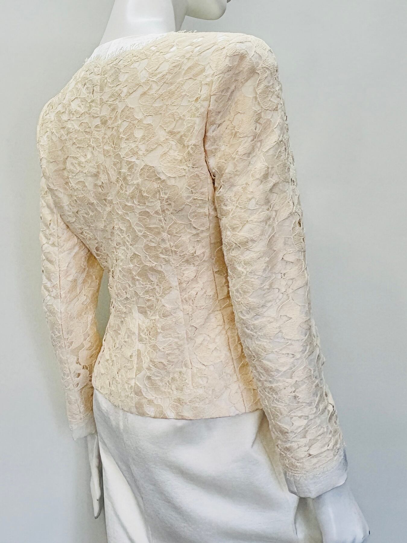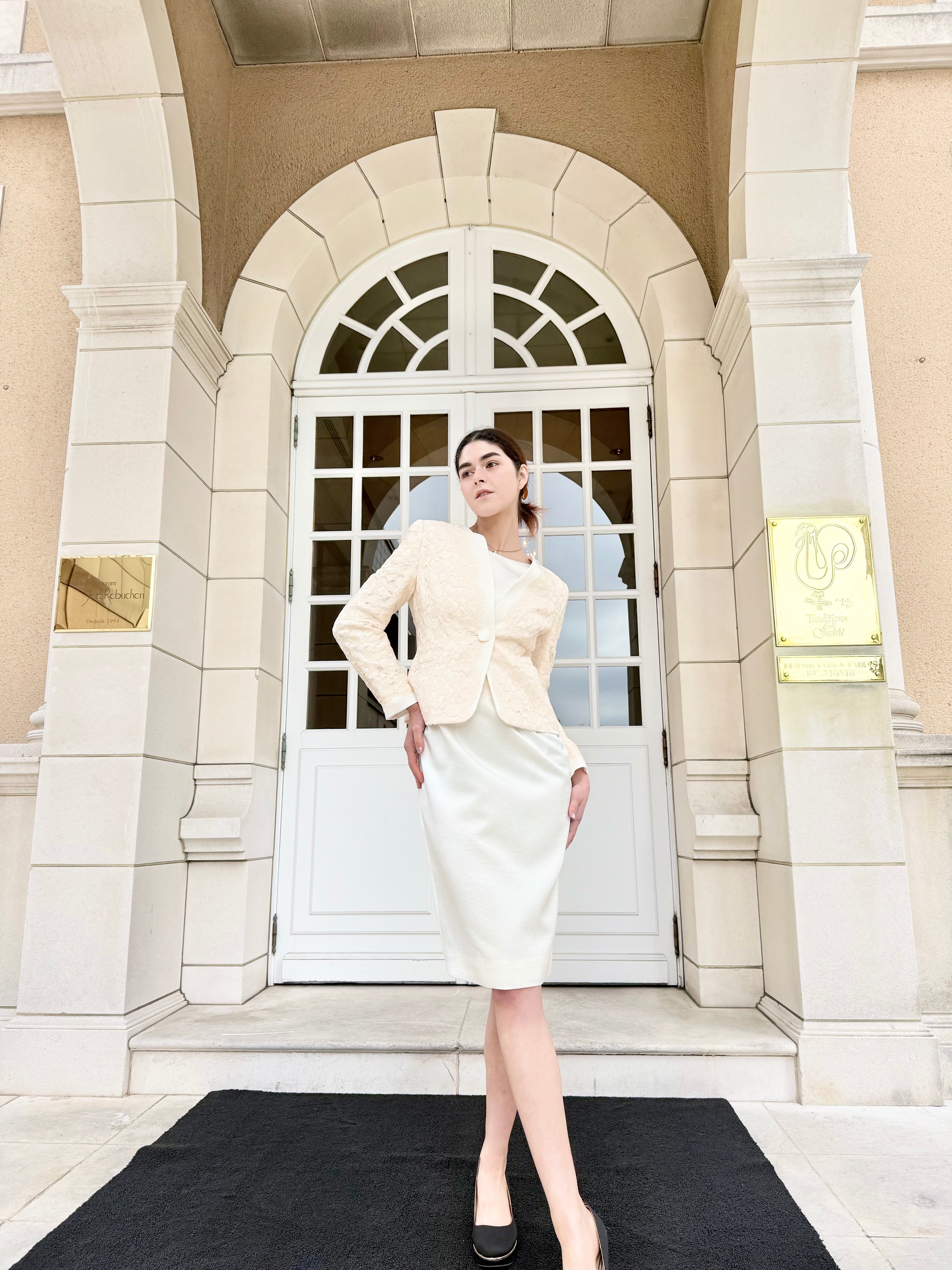 このジャケットは、ノーカラーのデザインが印象的で、繊細なホワイトのレースが魅力です。軽やかな素材感が心地よい着心地を提供し、カジュアルな日常から特別なシーンまで幅広くご利用いただけるアイテムです。着用することで、優雅さを感じさせる素敵なスタイルを体験できる一着を、ぜひお手に取ってみてください!